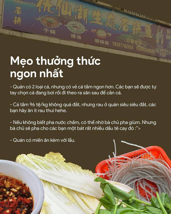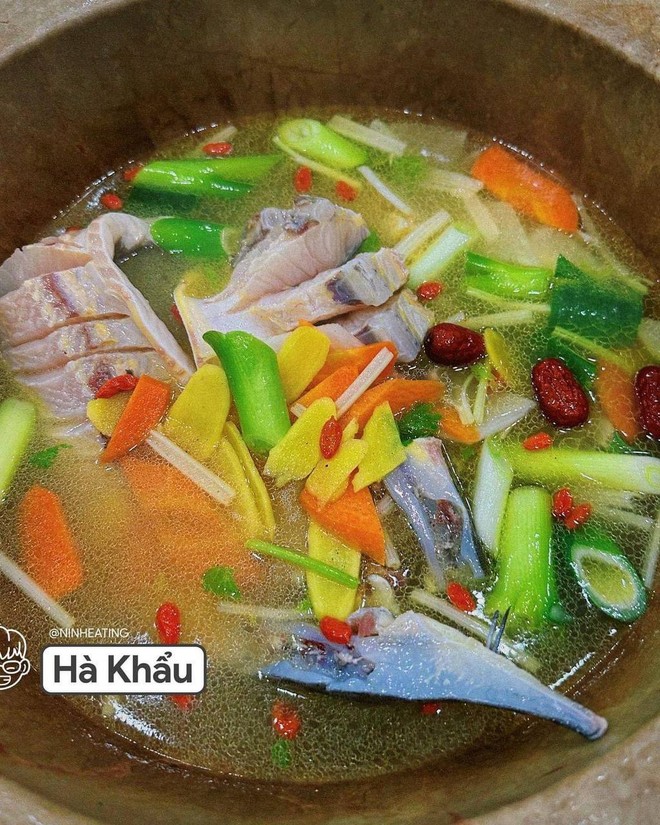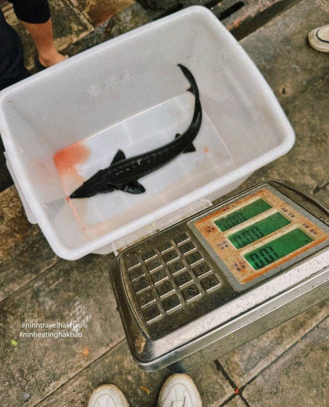 Cũng là một món không thể không thử khi vi vu Hà Khẩu đặc biệt là những ai đi chơi cùng cả gia đình. Cá tầm có đặc trưng là ngậy ngậy, béo hơn so với những loại cá khác song ăn không bị mỡ. Ở Hà Khẩu ăn kèm lẩu cá sẽ có món rau khá độc lạ chính là rau đậu Hà Lan tuy có mùi giống mồng tơi lai rau ngót nhưng ăn lại ngọt sần sật và giòn giòn. Tuy nhiên rau ở đây lại khá đắt. Tại quán thực khách cũng có thể tự pha nước chấm ăn kèm, nếu không biết có thể nhờ chủ quán.