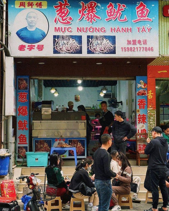 Là một phần của Trung Quốc vậy nên Hà Khẩu nổi bật với những món thịt xiên đậm phong cách ẩm thực Trung hoa. Đến Hà Khẩu hội mê ăn uống khó lòng bỏ qua mực nướng ông Trọc - đặc sản Trùng Khánh. Mỗi xiên mực có khoảng 2 miếng, giòn, đậm sốt thực khách Việt có thể sẽ thấy hơi mặn chút như không quá cay. Quán mở cửa lúc 1h chiều, nếu muốn thưởng thức số lượng lớn thì du khách có thể gọi điện đặt trước sẽ không phải đợi lâu.