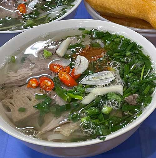 Món quẩy trứ danh ăn kèm vừa giòn vừa ngon lại bùi bùi ăn kèm với nước phở thơm ngậy béo. Chẳng thế mà khách ở đây rất chịu khó, chịu khổ khi chấp nhận ngồi ghế thấp, tự tay bưng bát phở nóng và say sưa ăn.