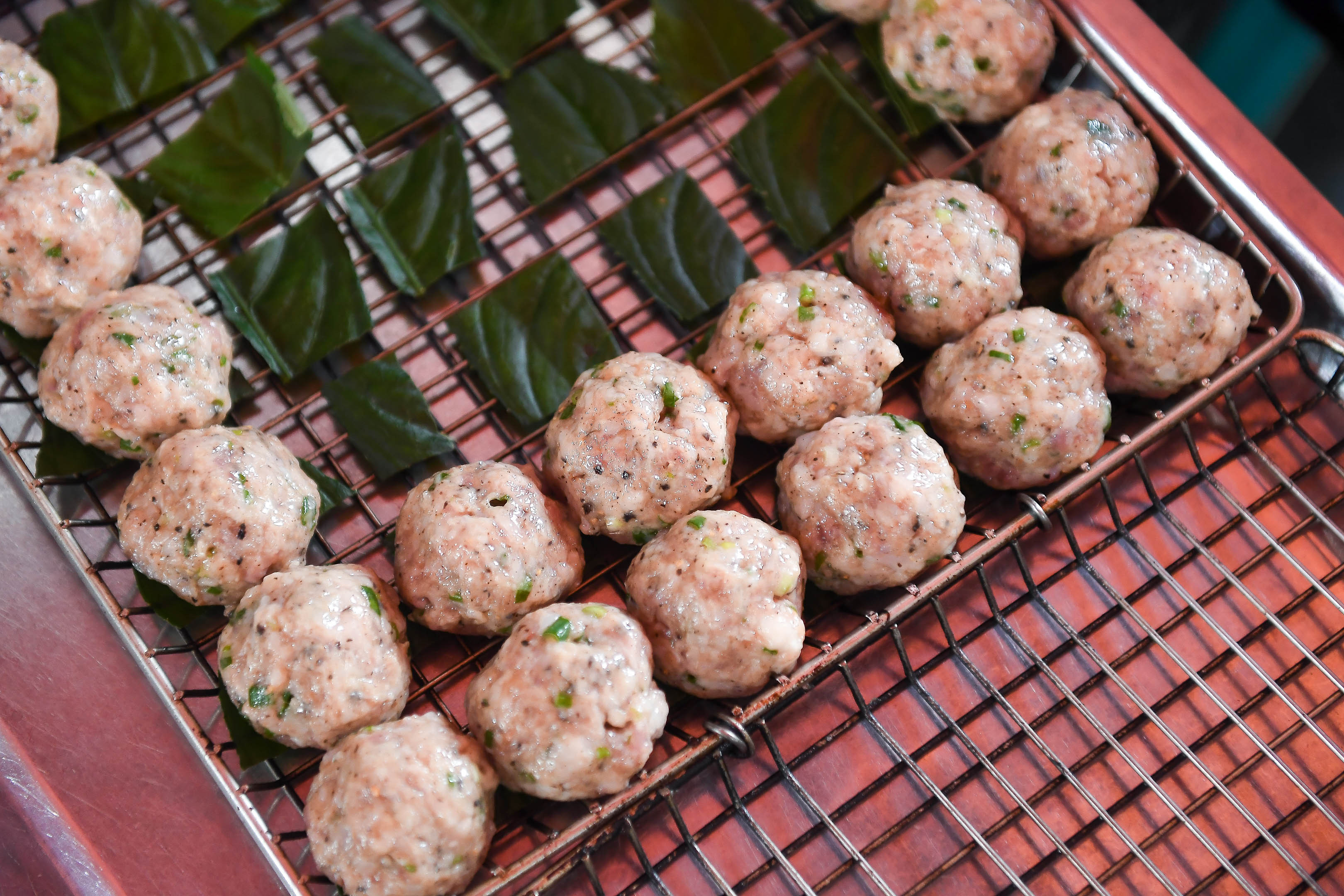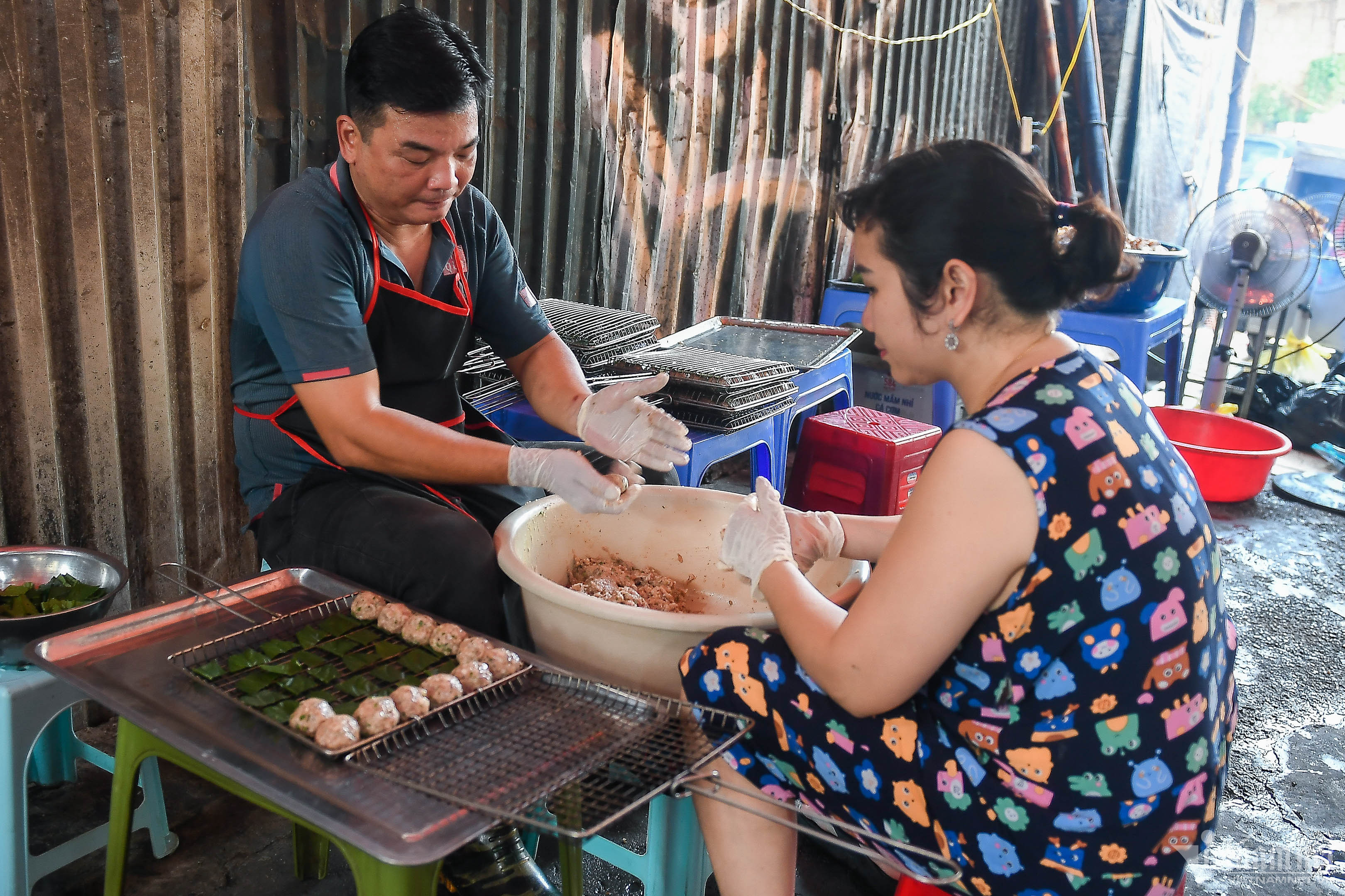 Anh Long, con trai bà Hà thường là người trực tiếp làm chả băm. Thịt được băm đủ mỡ đủ nạc, đem ướp gia vị rồi vo thành viên tròn. "Thịt băm nhà mình sẽ trộn thêm hạt tiêu để dậy mùi thơm", anh Long nói. Khi đặt vào vỉ, anh Long để thêm miếng lá xương sông cắt nhỏ giúp tăng mùi thơm và chả không bị cháy.