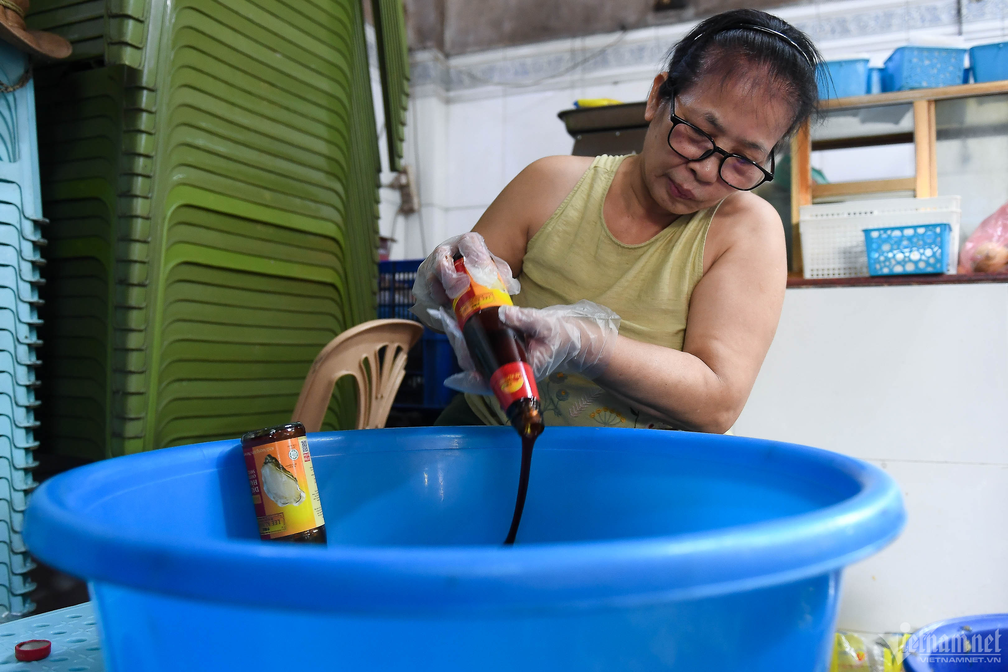 Phần nước chấm đều do bà Hà pha. Không chia sẻ cụ thể công thức nhưng bà cho biết, để nước chấm ngon phải dùng nước mắm "xịn". Bà thường chọn nước mắm cá cơm Phú Quốc hoặc Nha Trang, độ đạm 30-35. Các gia vị như tỏi, ớt cũng chọn kĩ, tỏi ta tự bóc tự băm, ớt bống cay đặc trưng của Huế.