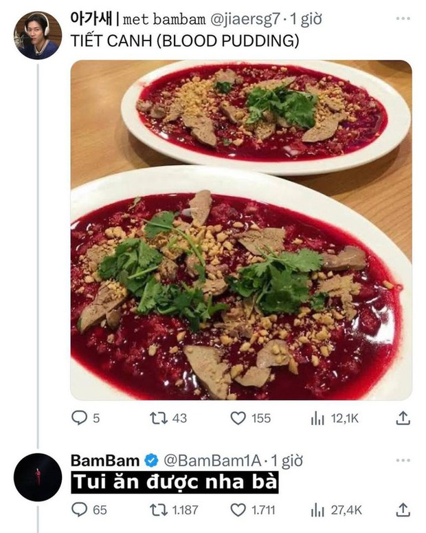 Ngập tràn trong ma trận món độc lạ ở Việt Nam là vậy, nhưng cuối cùng BamBam cũng chốt món bánh tráng trộn và hỏi thêm địa chỉ để tìm mua tại Sài Gòn. Người hâm mộ lại tiếp tục gợi ý các địa điểm ngon cho nam ca sĩ. Có lẽ nhân dịp đặt chân đến "đất nước hình chữ S", BamBam hẳn sẽ tranh thủ thưởng thức rất nhiều món ngon của ẩm thực Việt.