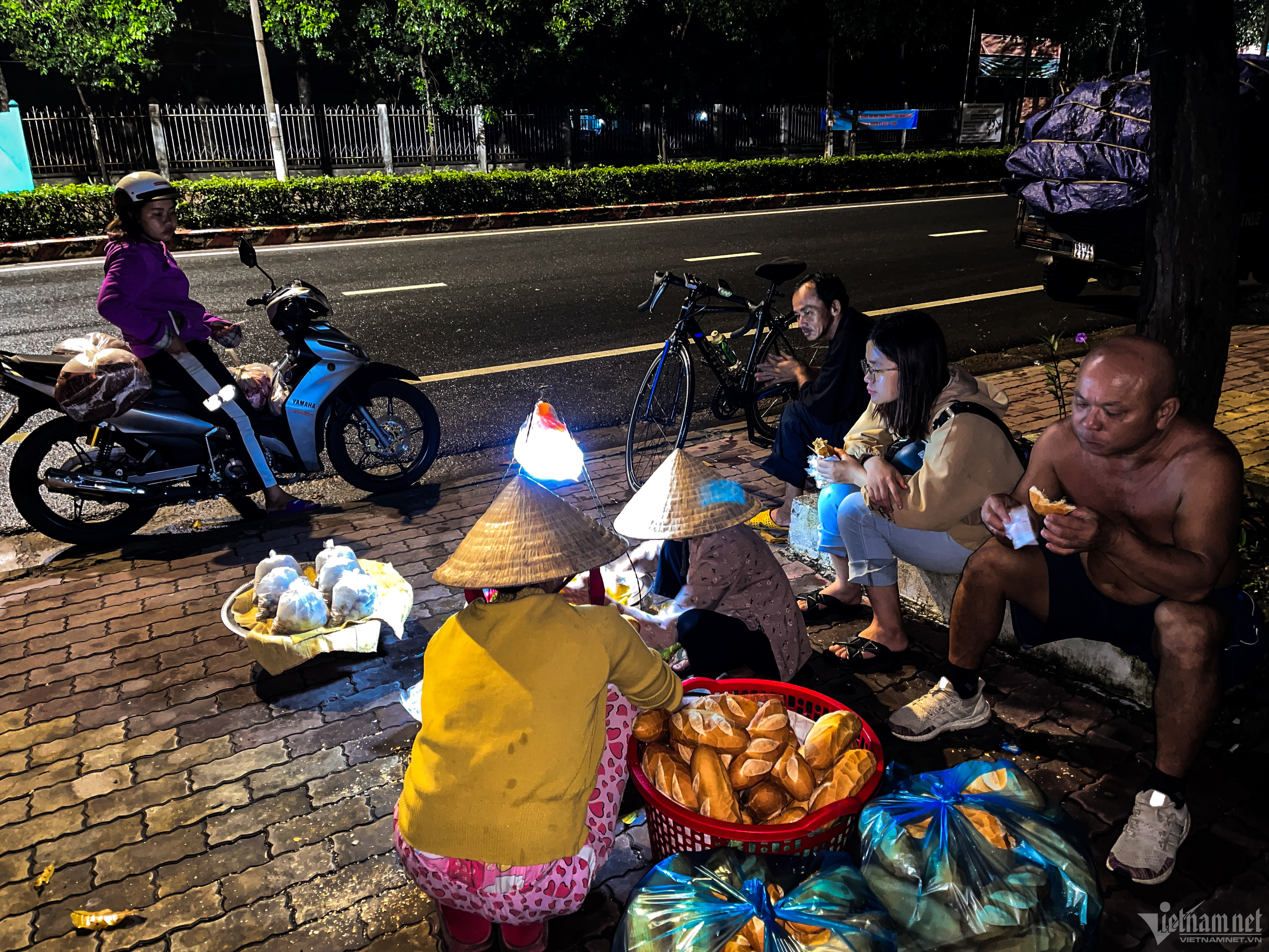Trong đêm khuya tĩnh mịch, ánh đèn điện leo lắt, bà Ngang lót chiếc dép phía dưới, ngồi bệt trên nền vỉa hè. Hình ảnh này đã trở nên quá đỗi quen thuộc với nhiều người dân, người lao động trên đoạn đường Nguyễn Chí Thanh, phường Tân An, thành phố Thủ Dầu Một. Hơn 30 năm qua, cứ đều đặn 3 giờ sáng, ngoại Sáu (tên khách thường gọi bà Ngang) lại lom khom gánh hàng bánh mì đi từ nhà đến nơi bán, mất gần 30 phút.