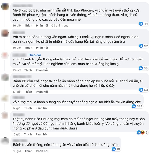 Đáp lại nhận xét của vị khách này, hàng loạt cư dân mạng phản đối, cho rằng đây là vấn đề "khẩu vị của mỗi người khác nhau". Hơn nữa, dòng bánh Trung thu nhân thập cẩm như của Bảo Phương vẫn thường kén người ăn. Và theo kinh nghiệm thì khi mua bánh mới về, thay vì ăn ngay (sẽ thấy vỏ bánh bị cứng) thì nên để vài hôm cho "xuống dầu" sẽ mềm và ngon hơn. Cùng với đó, không ít cư dân mạng vẫn dành lời khen cho thương hiệu bánh Trung thu này.