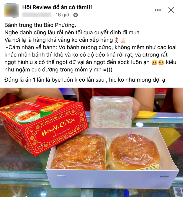 Đã không ít lần, có những nhận xét trái chiều đưa ra về bánh Trung thu Bảo Phương. Mới đây, trên một hội nhóm ăn uống lại tiếp tục có một bài nhận xét về bánh Trung thu của thương hiệu này. Cụ thể, chủ bài đăng cho biết nghe danh tiếng đã lâu nên năm nay mua thử, thế nhưng trải nghiệm không như mong đợi vì ăn bánh bị cứng, quá ngọt...