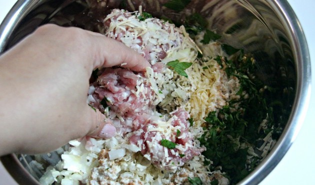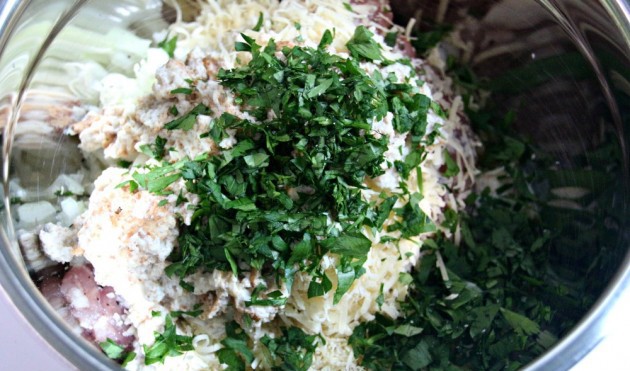 Bước 2: Cho thịt băm, phô mai Parmesan, mùi tây, hành tây, trứng, tỏi băm, muối, tiêu và hỗn hợp đã chuẩn bị vào một bát lớn.