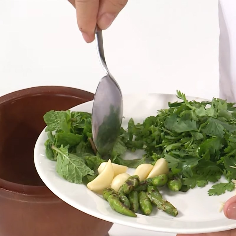 - Bạn cho 1 thìa canh húng lủi cắt nhỏ, 1 thìa canh ngò rí cắt nhỏ, 1 thìa canh ngò gai cắt nhỏ, 5 - 6 trái hiểm xanh nướng, 1 thìa canh gừng cắt sợi, 3 tép tỏi, 1 thìa cà phê mắc khén, 1 thìa cà phê bột canh vào cối, giã nhuyễn rồi thêm 1 thìa canh nước cốt chanh.