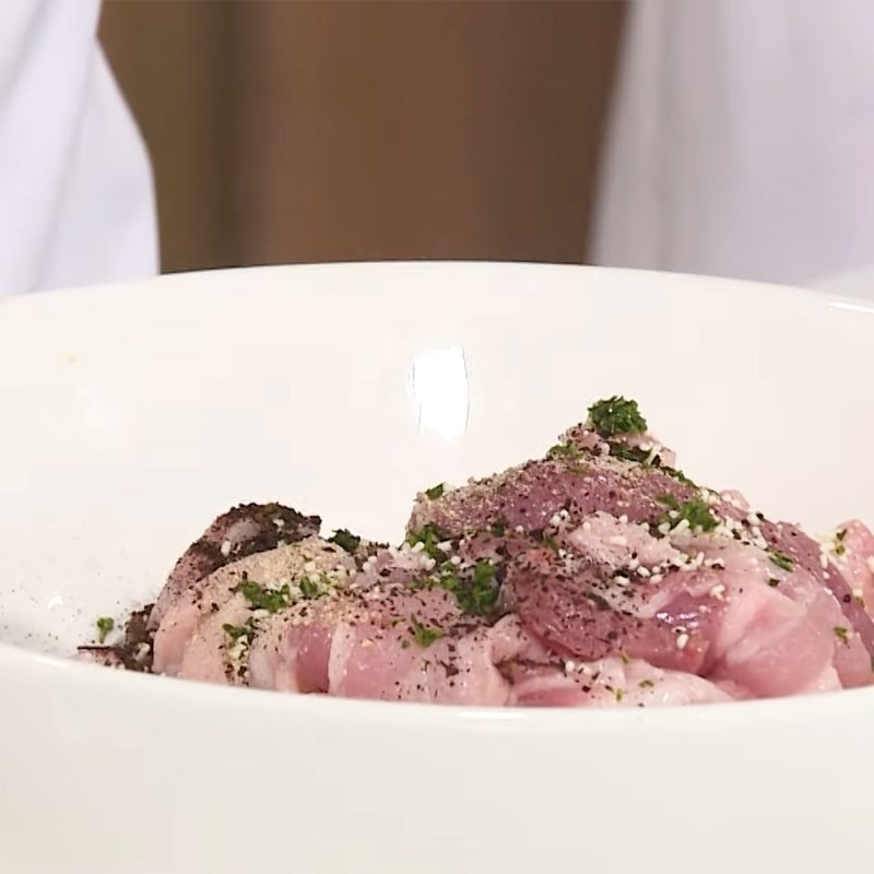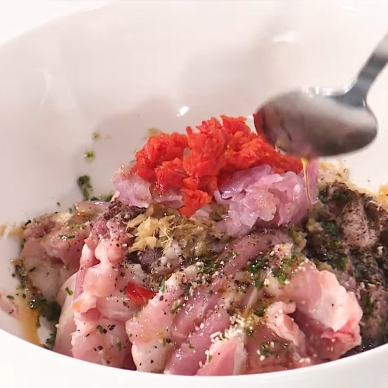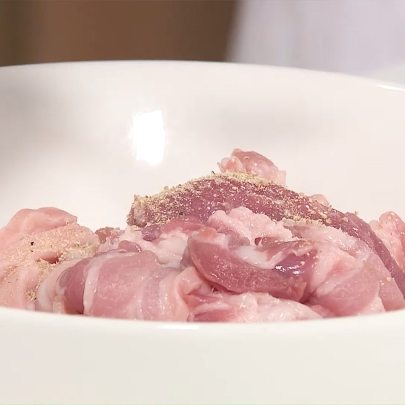 Cho thịt heo đã cắt ra tô để ướp, ướp thịt với 1 thìa canh dầu ăn, 1/2 thìa cà phê tiêu, 1 thìa cà phê hạt nêm, 1.5 thìa cà phê mắc khén rang giã nhỏ, 1/2 thìa canh nước mắm.