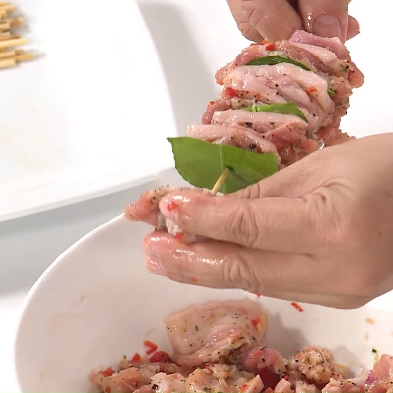 - Bạn dùng xiên tre để xiên thịt, cứ 2 miếng thịt là đến 1 lá chanh, lần lượt như vậy cho đến khi hết. Mỗi xiên bạn có thể xiên từ 6 - 8 miếng thịt.