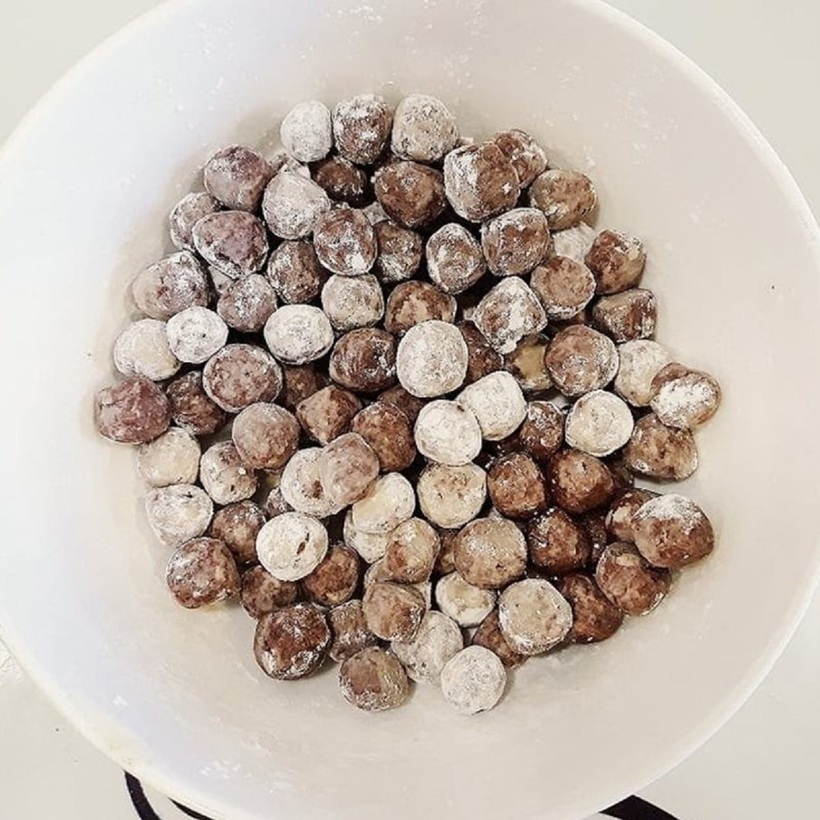 Kế tiếp, rải 1 ít bột năng ra thớt rồi cho khối bột lên, thoa ít bột năng lên tay cho khỏi dính, khéo léo lấy bột ra vo viên tròn nhỏ.