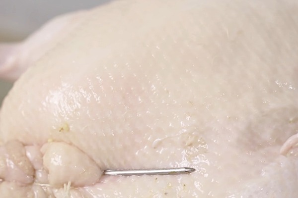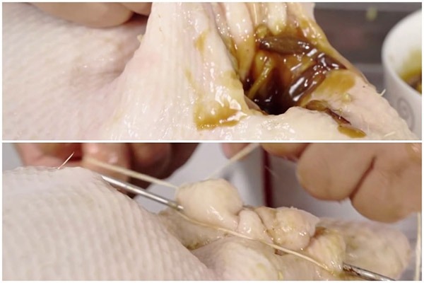 Dùng xiên tre hoặc xiên inox và chỉ, may phần bụng vịt lại.