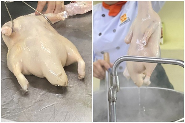 -Chỉ nên xối nước sôi sơ qua cho da vịt săn lại, không xối quá lâu vì có thể khiến lớp da bị chín và không bám màu.