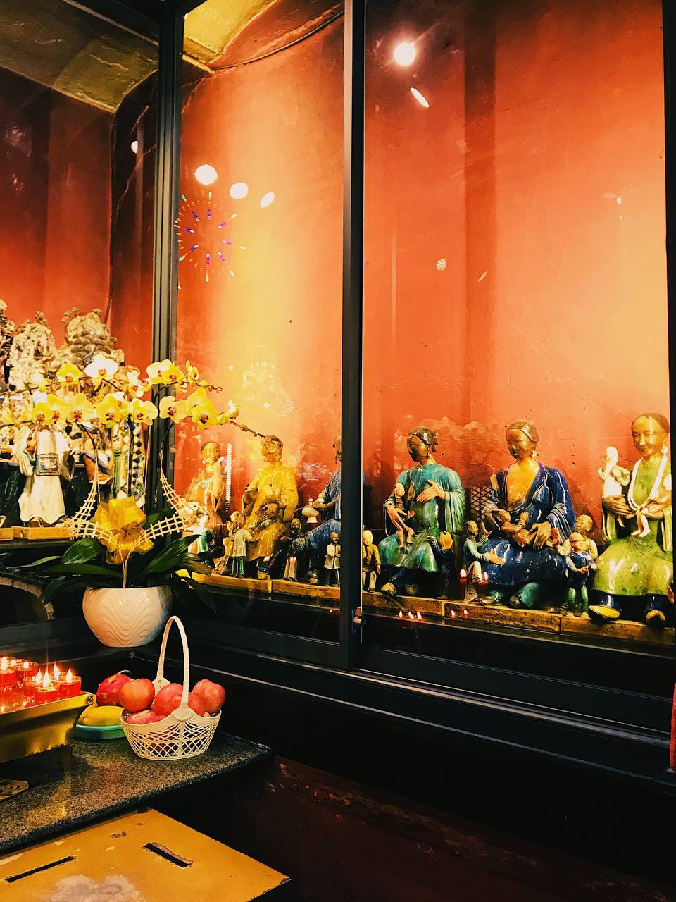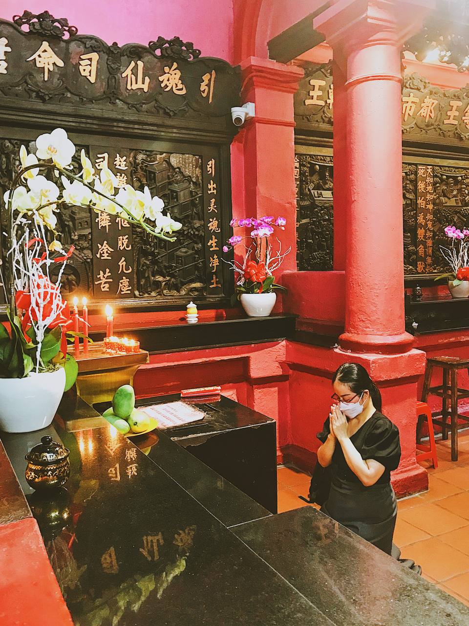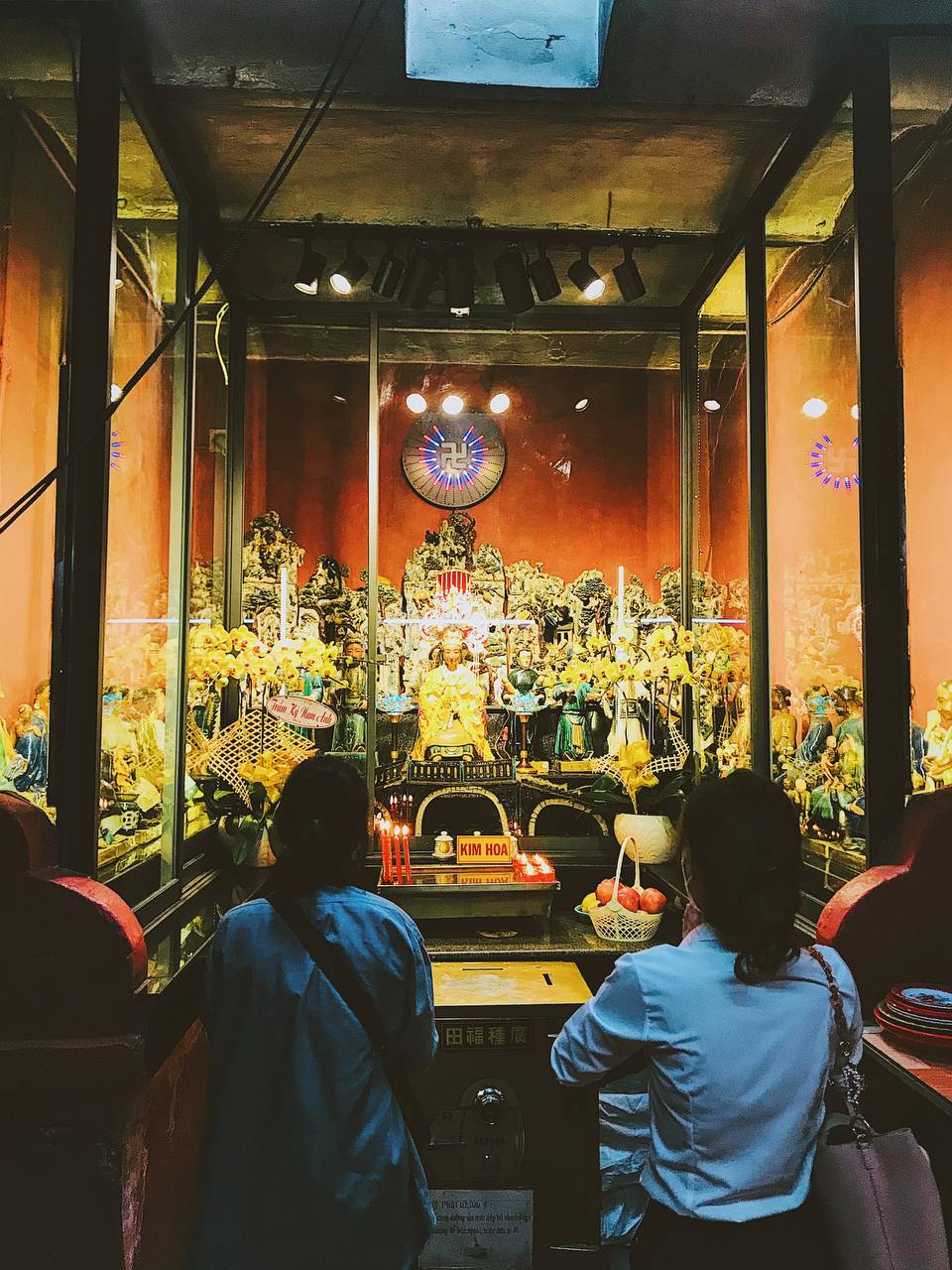 Chùa có hướng dẫn lối vào thăm rất kỹ càng và chu đáo. Cũng giống như một lời chào kính cẩn, chúng tôi có thắp nén tâm hương ngay từ ngoài cửa điện. Men theo lối vào, chúng tôi có thăm từng điện thờ. Kiến trúc lẫn bài trí trong chùa rất tinh xảo, các tượng cũng mang màu sắc sáng sủa, rực rỡ. Đến chùa, nếu không chuẩn bị lễ cầu nguyện, bạn có thể bỏ chút tiền công đức để dâng tiền đèn nhang. Khi đang chiêm bái ở Chính điện, chúng tôi còn được người xếp lễ cho lộc là hai quả xoài.