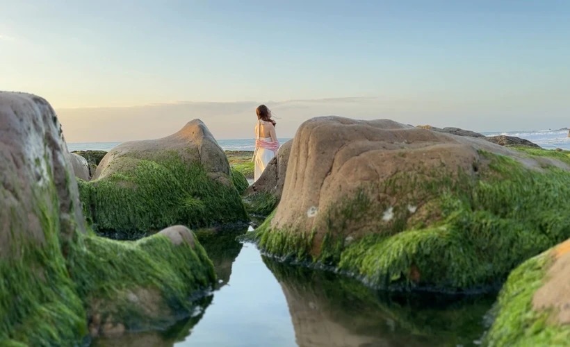 Chị Nguyễn Tuyết Sương, đến từ Đồng Nai chia sẻ, thấy trên mạng xã hội có nhiều bài đăng giới thiệu về bãi rêu nên chị nhờ người quen canh thời điểm rêu đẹp để ra Tuy Phong du lịch. Dù phải thức dậy khá sớm để “săn rêu” nhưng đổi lại, chị được trải nghiệm không gian bình yên ở biển, đón bình minh, ngắm rêu xanh, được tiếp thêm sức cho ngày mới.