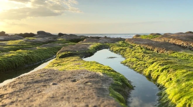 Cứ độ vào Rằm tháng Chạp, bãi đá ở biển Cổ Thạch, huyện Tuy Phong (tỉnh Bình Thuận) lại khoác lên mình một vẻ đẹp như tranh bởi màu xanh của những lớp rêu mềm mịn như nhung, tạo nên sức quyến rũ đối với người dân và du khách.