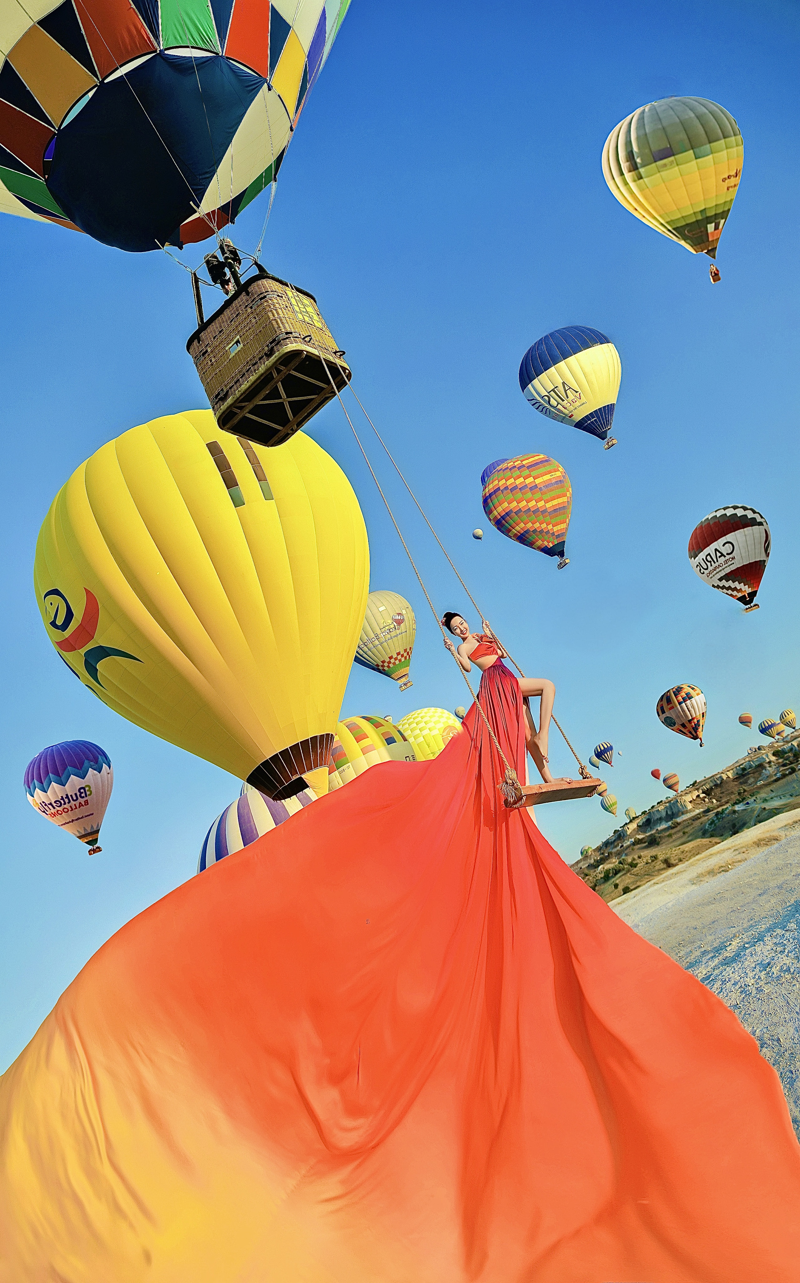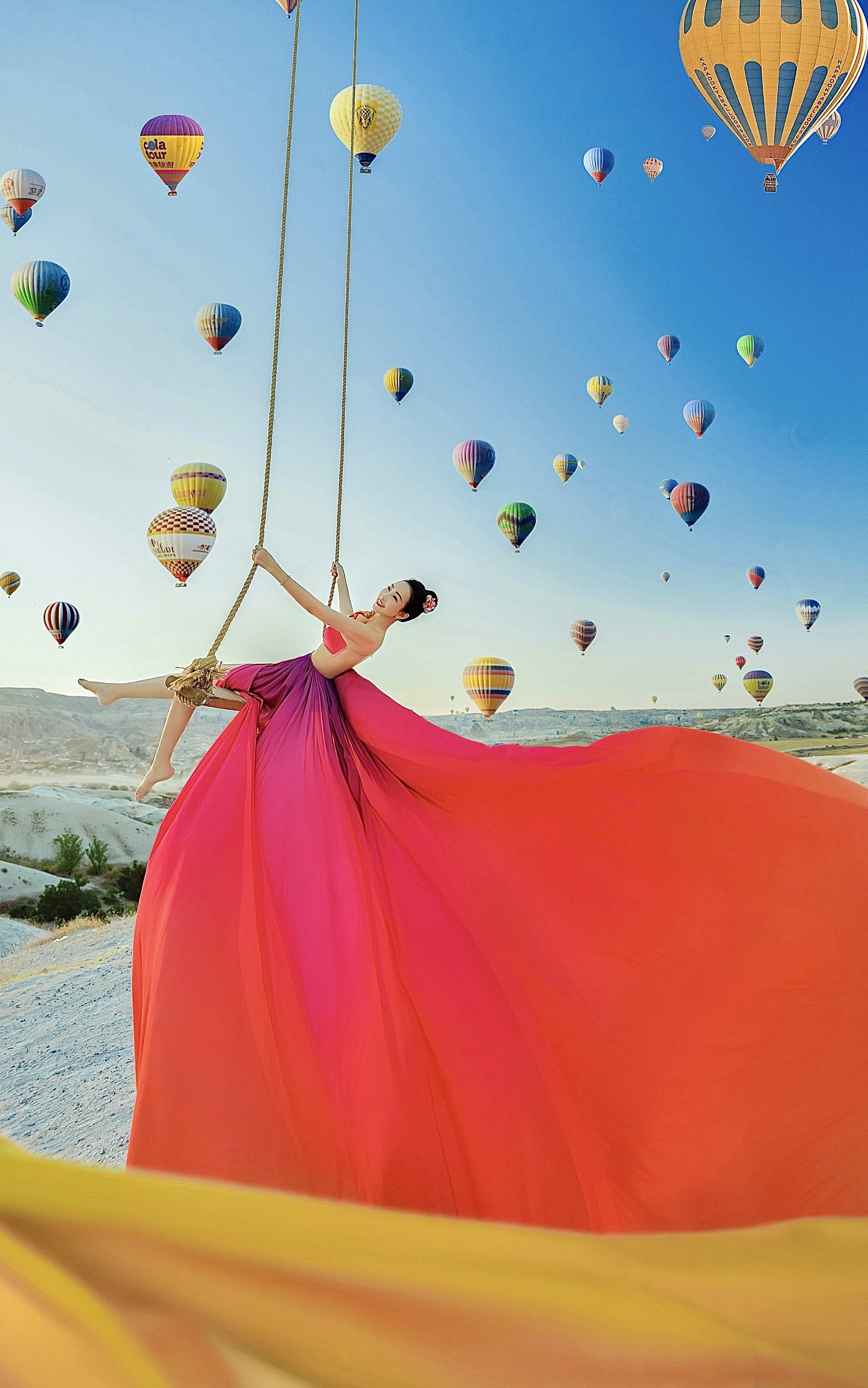 Buổi sáng đầu tiên tại Cappadocia, chị Nhung dành trọn thời gian để chụp hình, thực hiện bộ ảnh quan trọng nhất với mong muốn bắt trọn khoảnh khắc “bầu trời rợp khinh khí cầu” và trải nghiệm ngồi trên xích đu được treo từ chính chiếc khinh khí cầu mà chị thuê riêng.