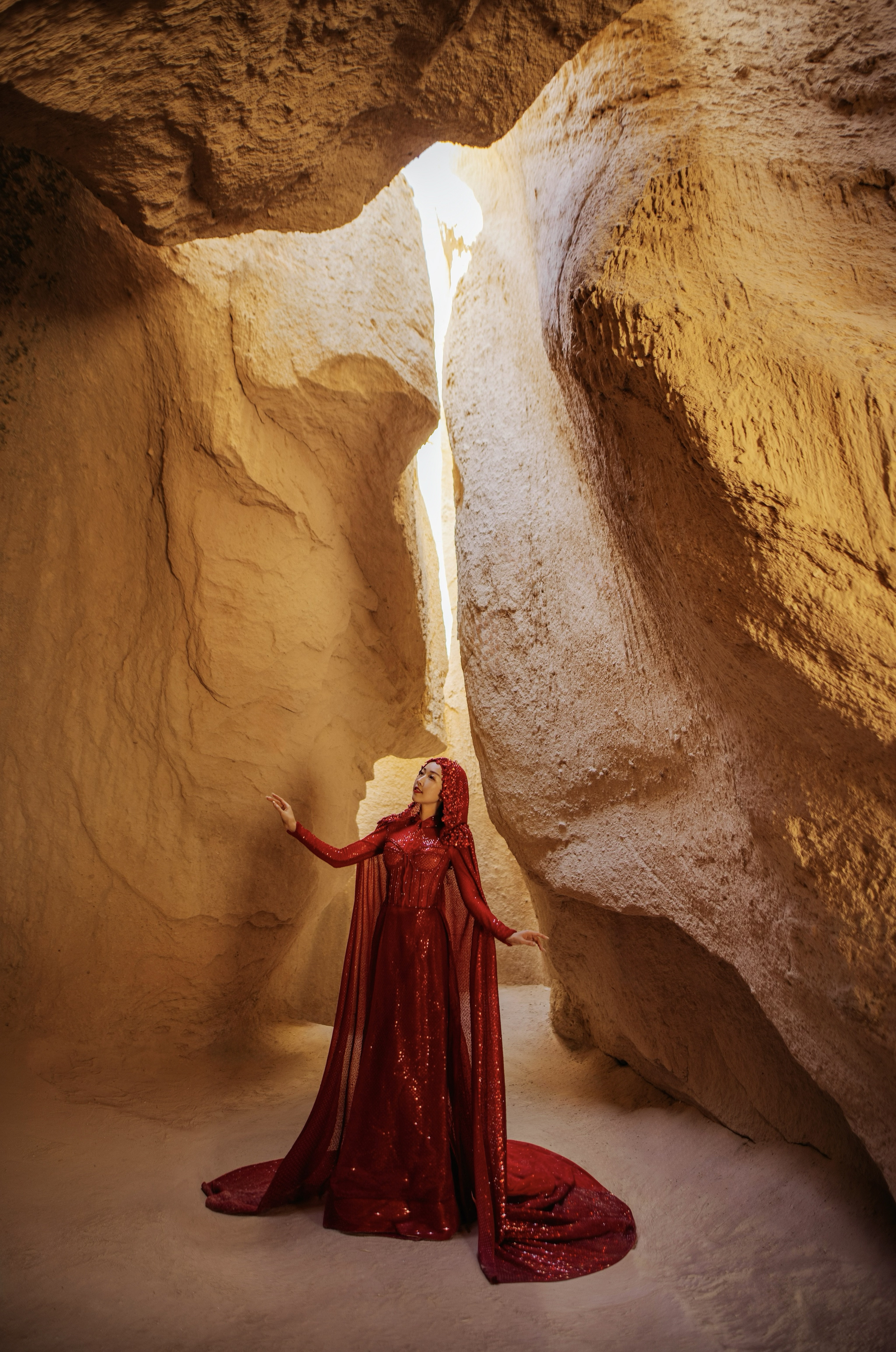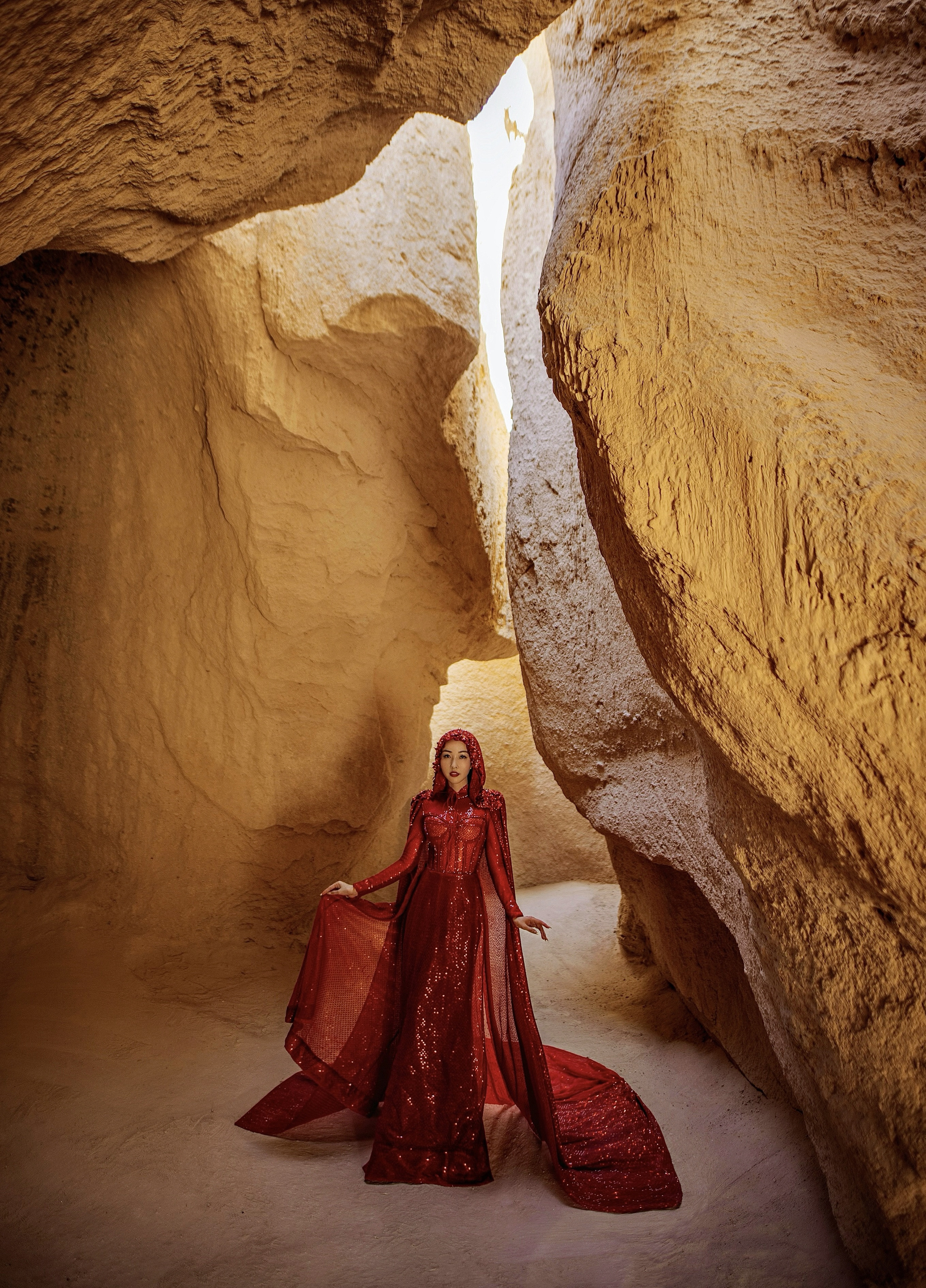 Trong đó, chị ấn tượng và tâm huyết nhất với bộ áo dài cách tân mang phong cách huyền bí. Bộ trang phục này được chị lựa chọn chụp tại một hang động không có tên gọi, cũng không phải địa điểm nổi tiếng và hầu như chỉ người bản địa mới biết đến.