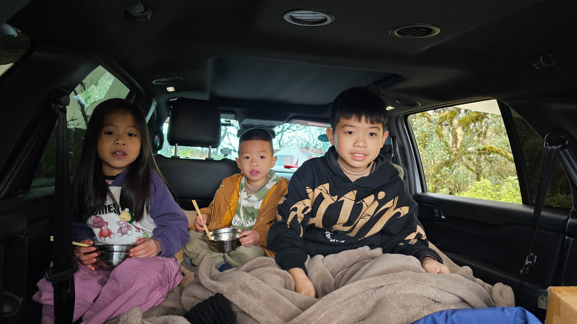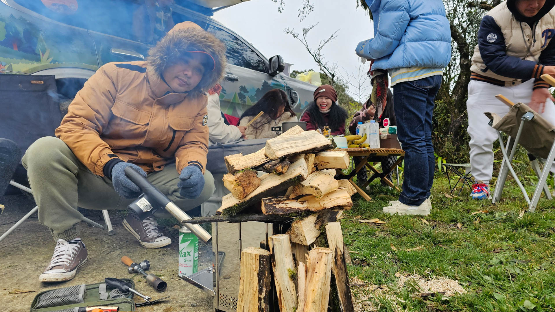 Ba gia đình đi cùng nhà anh Trường đều là những gia đình thường xuyên đi cắm trại nên trên xe ô tô trang bị đầy đủ lều trại, giường nệm, lò sưởi, bếp, bàn ăn, đồ ăn nhanh... Một gia đình trong đoàn di chuyển từ Hải Phòng trong đêm.