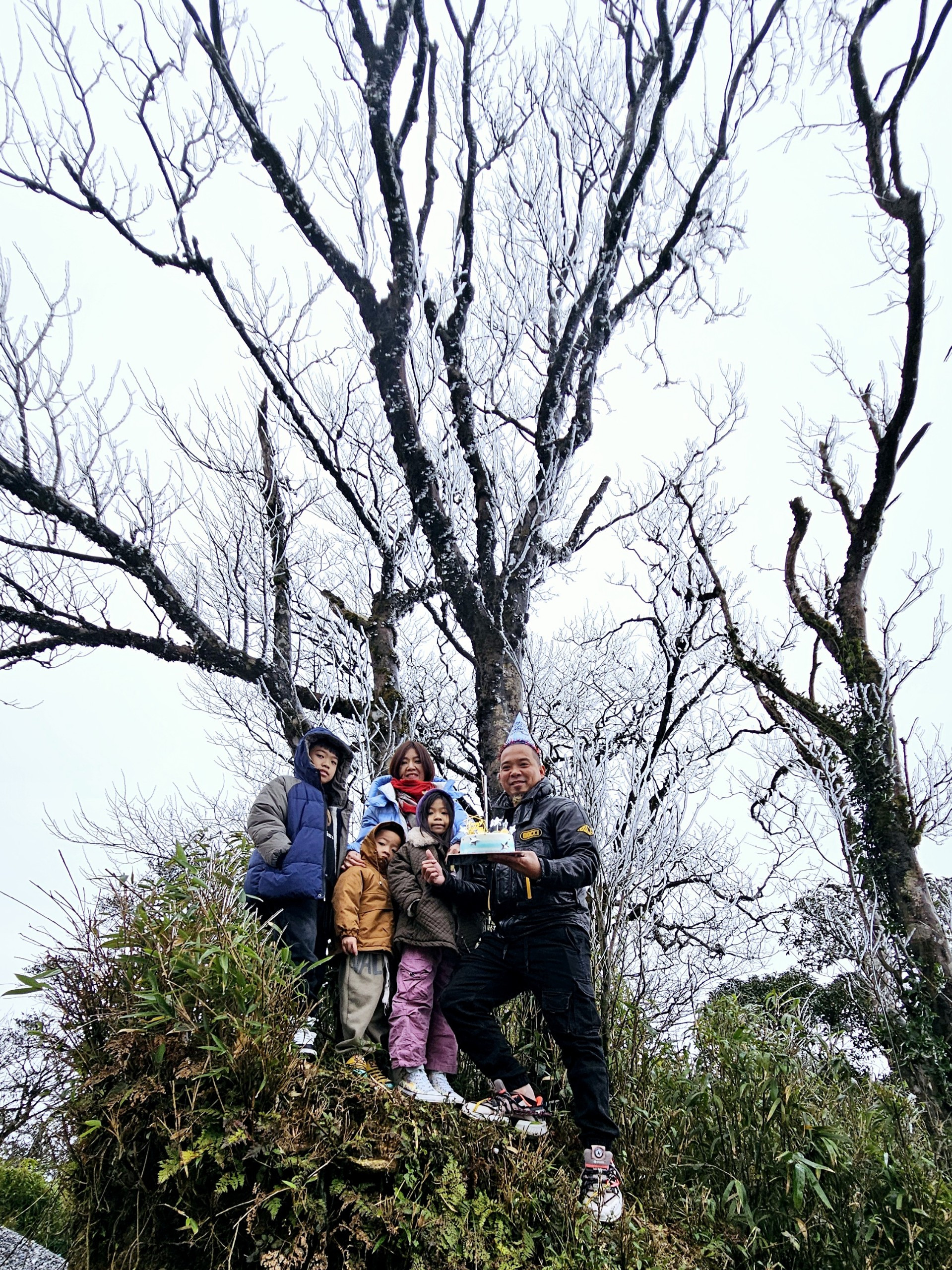 "Đây là lần thứ hai gia đình mình đón băng giá tại Phja Oắc cùng nhau. So với chuyến đi tháng 2/2022, hôm nay trời quang hơn, ít sương mù, không có mưa phùn nên cảm giác bớt khắc nghiệt. Cả gia đình cũng đã có kinh nghiệm trong việc chọn trang phục giữ ấm", anh Trường cho hay.
