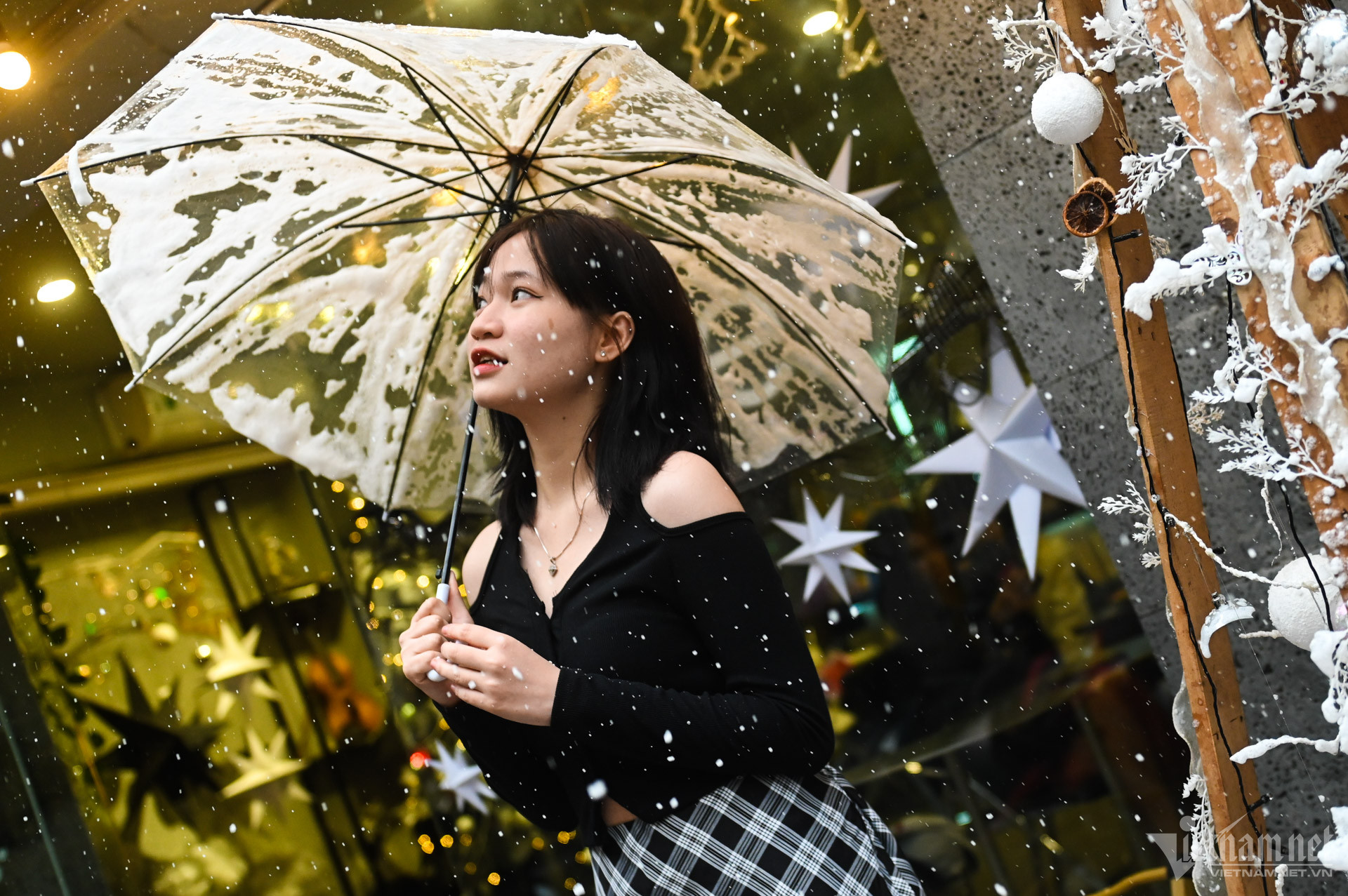 Mặc dù nằm trong ngõ quán này có chiêu hút khách bằng cách đầu tư máy phun tuyết giả. Tố Uyên (nhà ở quận Hoàng Mai) chia sẻ, cô biết đến quán qua các bài review. "Quán trang trí tone màu đen trắng nên cũng tạo sự khách biệt. Máy phun tuyết giúp những bức hình ảo diệu hơn nên mình khá thích", Tố Uyên nói.