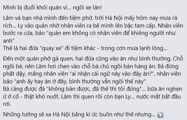 Bất ngờ hơn là lời trần tình từ cô chủ quán phở không giống như những gì V.M.L viết. Theo lời cô chủ, hôm đó hai vợ chồng người này có đến ăn. Và vì ngồi sát cô quá nên cô có nói: “Cháu ngồi bên kia uống nước thì rộng rãi hơn, ngồi đây thì chật quá cô khó bán hàng. Nhân viên vẫn bê tận nơi cho chứ không ai đuổi cả. Hai vợ chồng vẫn ngồi ăn bình thường”.