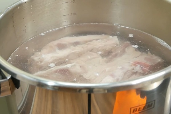 Xương heo rửa sạch, trụng qua nước sôi trong khoảng 3 phút, vớt ra, xả sạch lại.