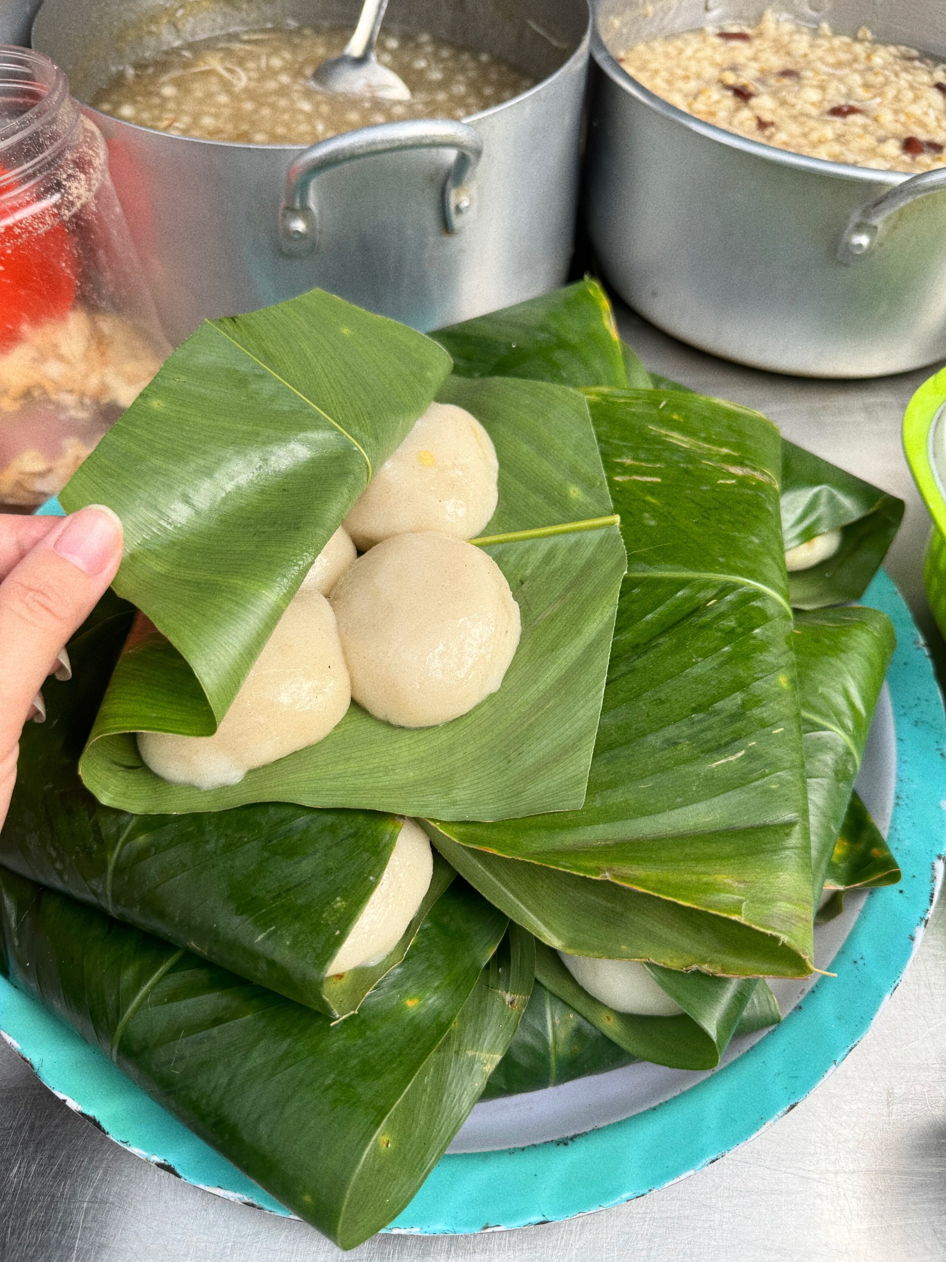 Bánh dùng có vẻ ngoài giống bánh trôi, bánh chay song kích thước to hơn, bằng nắm tay trẻ em. Bánh được đặt trong lớp lá dong, mỗi bọc 10.000 đồng/5 chiếc. Món bánh này cũng được chế biến với vài kiểu nhân đa dạng như nhân ngọt (đỗ xanh), nhân mặn (đỗ xào hành),…