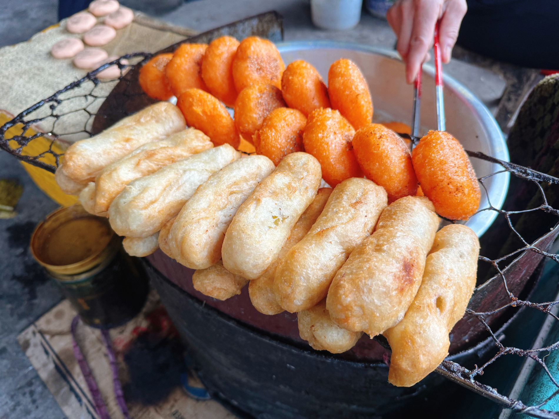 Những chiếc bánh rán giòn rụm, nóng hổi có màu cam bắt mắt là thức quà vặt được nhiều người yêu thích và thưởng thức khi đến chợ Bể. Bánh to cỡ 4 đầu ngón tay chụm lại, đầy ắp nhân đỗ, dừa bên trong nhưng giá “rẻ như cho”, chỉ 2.000 đồng/chiếc.