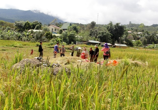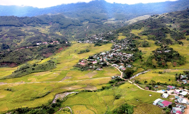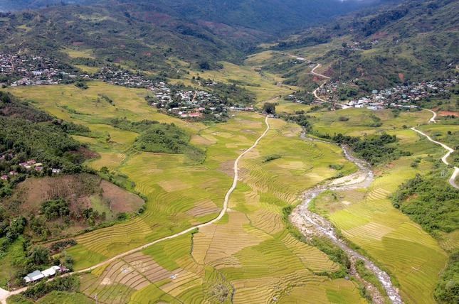 Hơn 200ha ruộng lúa bậc thang ở thung lũng núi Ngọc Linh đang chín vàng, toả hương ngào ngạt dưới tiết trời se lạnh. Cao nguyên tuyệt đẹp này thuộc xã Măng Ri, huyện Tu Mơ Rông, Kon Tum.