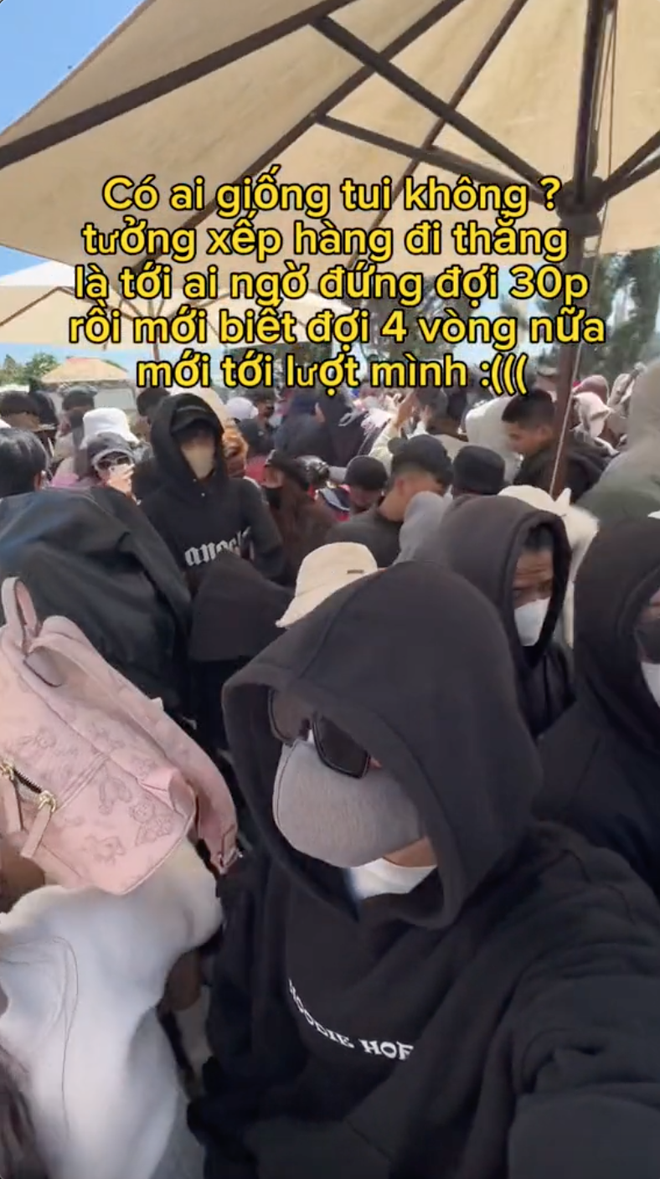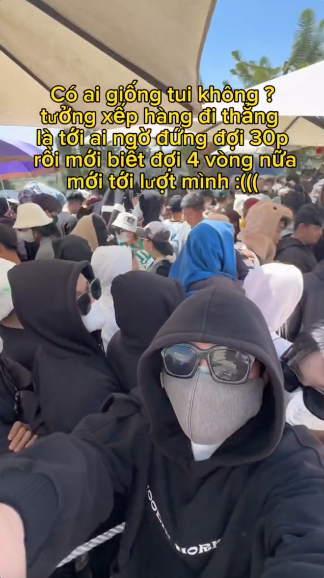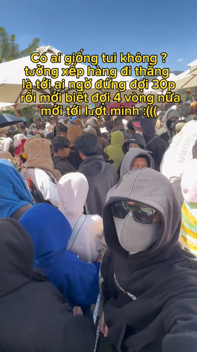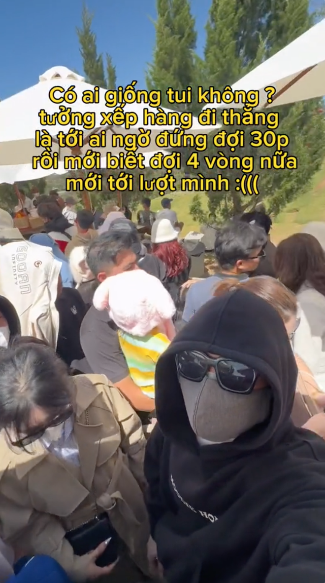 Không chỉ thu hút bởi có nhiều cảnh đẹp, khí hậu dễ chịu mà vài năm trở lại đây, du khách đến Đà Lạt còn cực kỳ thích thú với các nông trại, khu vui chơi. Và dù ngày càng có thêm nhiều địa điểm nông trại, khu vui chơi như vậy với diện tích lớn hơn, thế nhưng vẫn không tránh khỏi những thời điểm khách đông nghịt và phải chờ đợi rất lâu. Như mới đây, một du khách tới Đà Lạt đã chia sẻ hình ảnh dòng người đứng đợi cực đông tại một khu vui chơi nổi tiếng. Thậm chí, sau khi đợi 30 phút, cứ ngỡ sắp được vào chơi rồi nhưng vị khách này bất ngờ khi nhận ra sẽ phải "đợi 4 vòng nữa mới tới lượt mình".