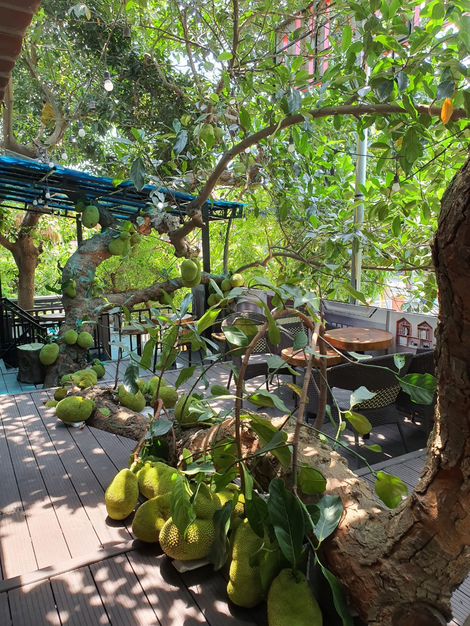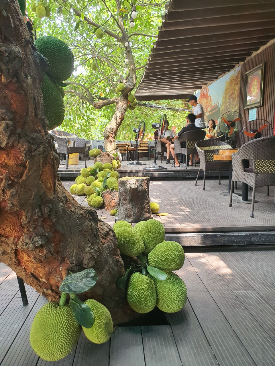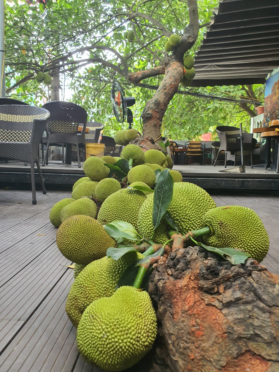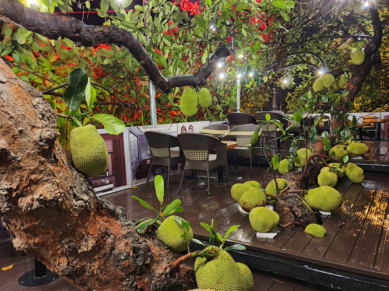 Khách và nhân viên thường xuyên kiểm tra độ chín của từng quả để thu hoạch, không để rụng, tránh gây nguy hiểm. Chủ quán cho biết, đây là giống mít dai, rất thơm ngon. Khi chín, quả sẽ tỏa mùi hương nhưng phần vỏ vẫn giữ màu xanh đẹp mắt.