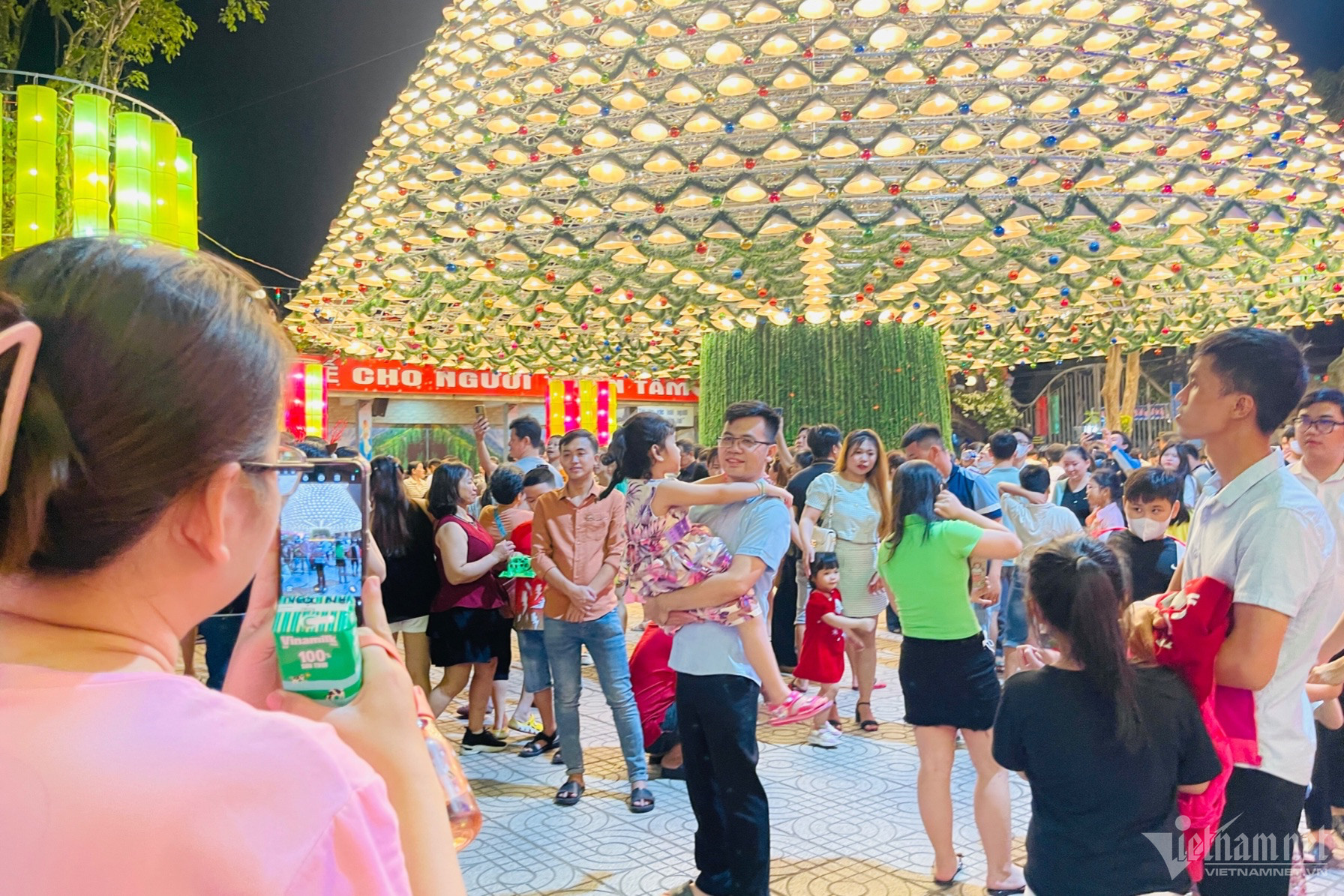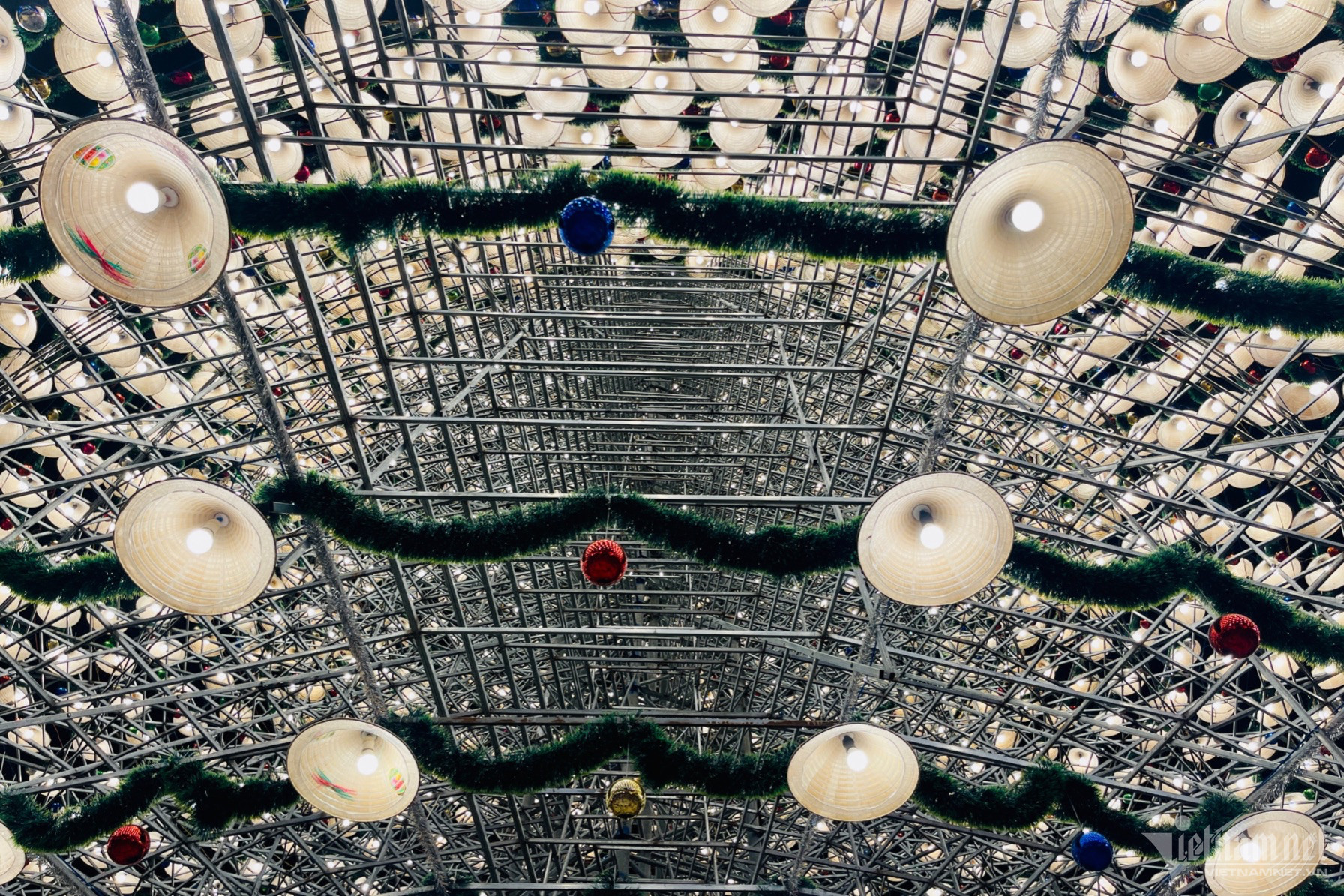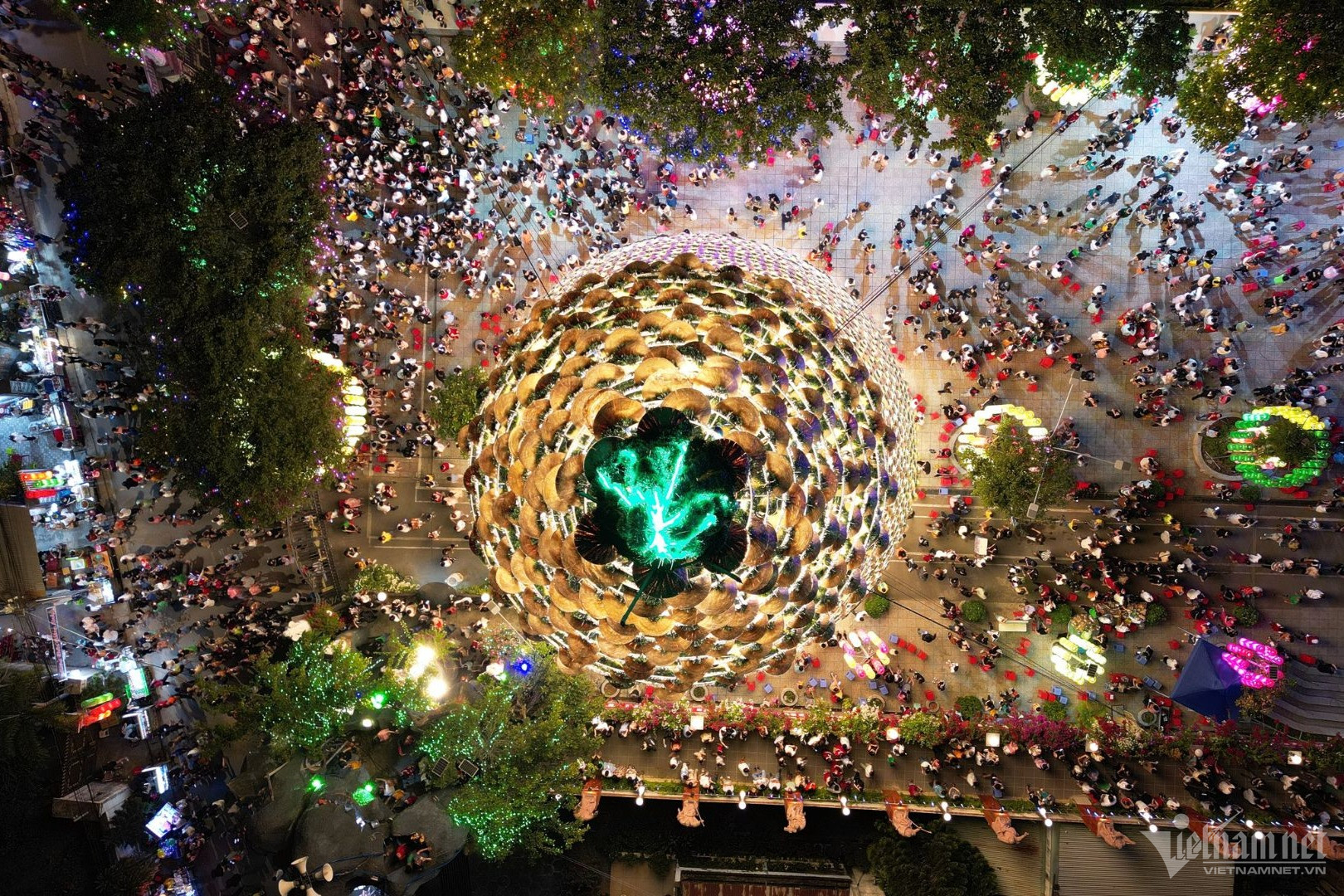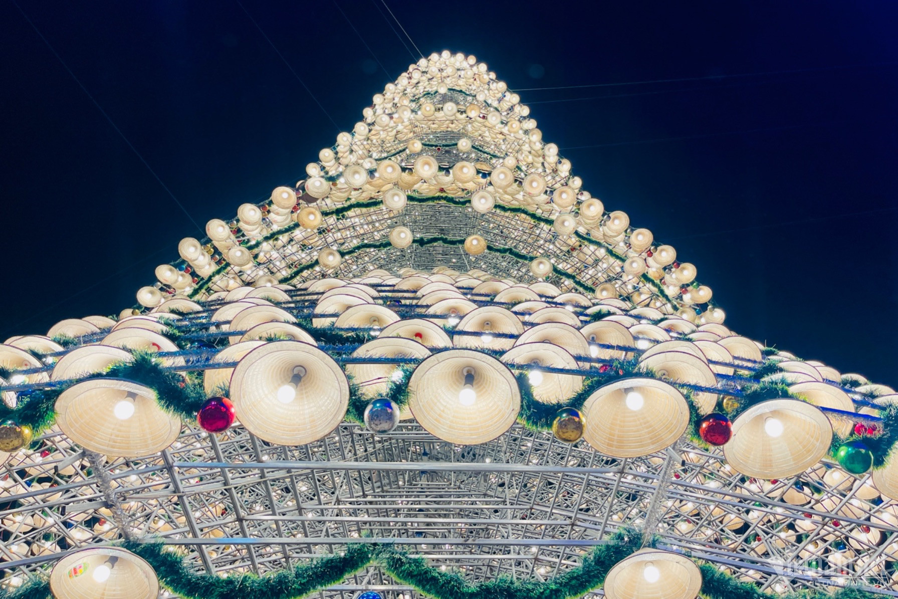 19h hằng ngày, cây thông cao 47m được làm từ 4.200 chiếc nón lá bắt đầu lên đèn. Bên trong mỗi chiếc nón lá là một bóng đèn, với 5 tầng tạo thành hình cây thông lung linh rực rỡ.