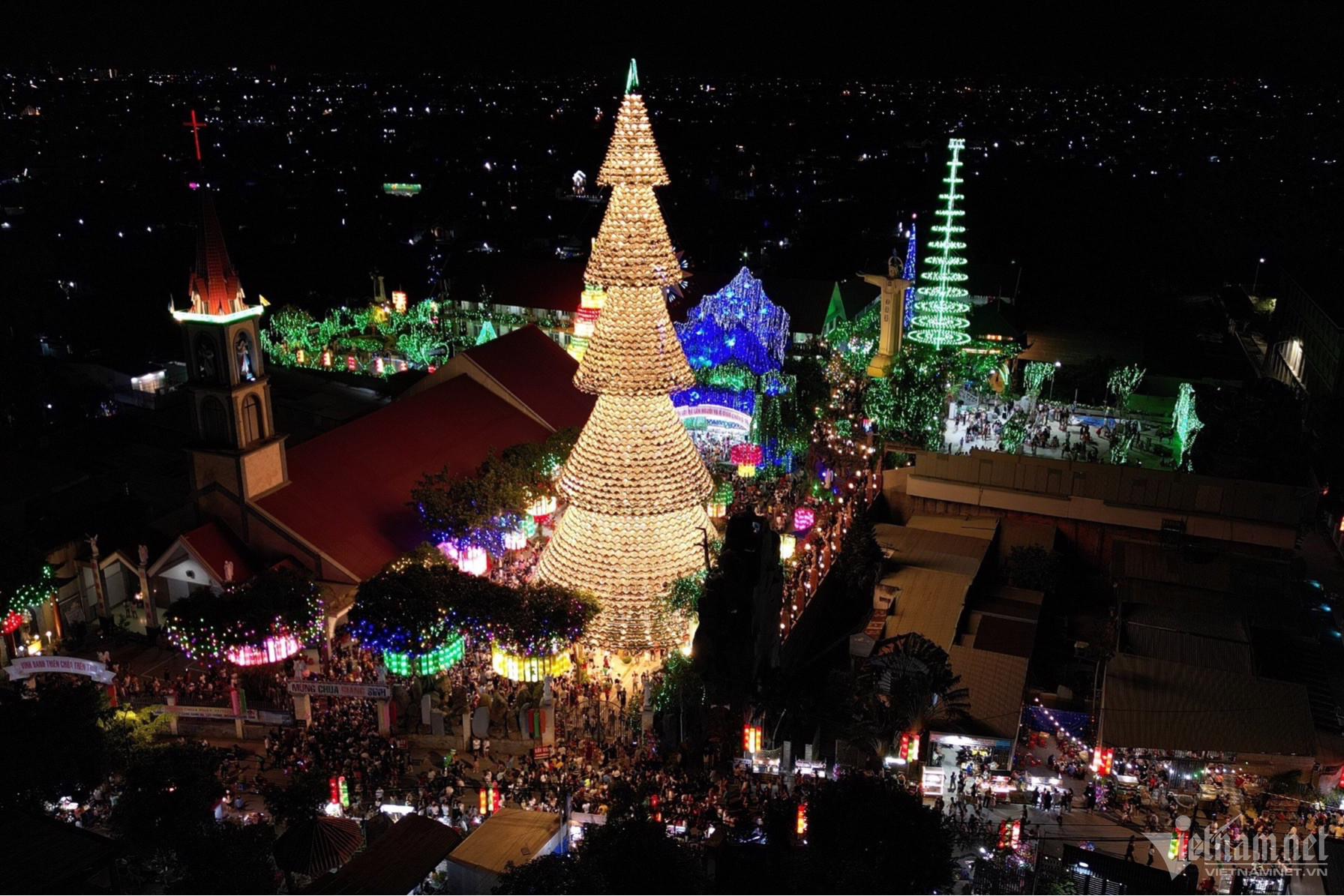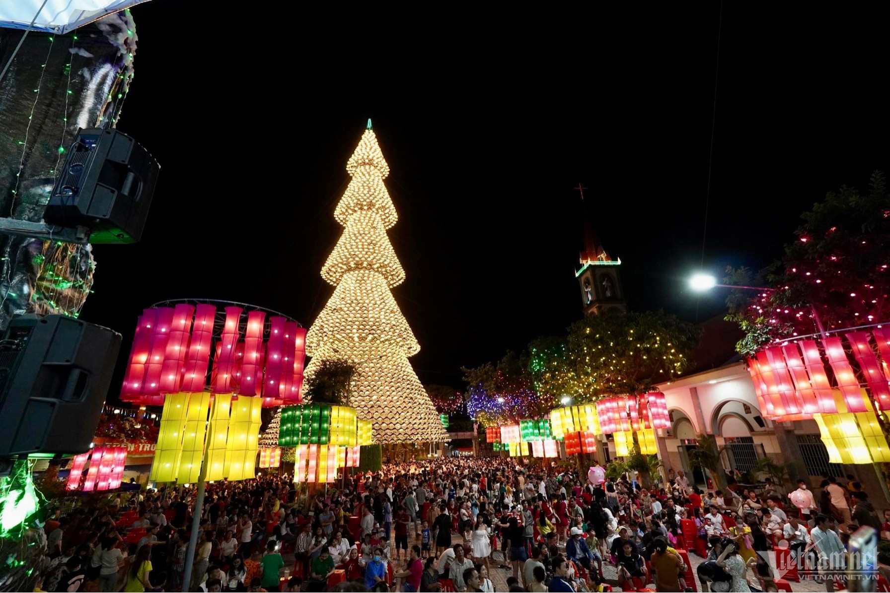 Tại nhà thờ Hà Phát, ngoài cây thông nón lá “siêu cao” còn có nhiều công trình hang đá, đèn lồng xếp hình bánh nhiều tầng,... cũng được trang hoàng lộng lẫy với những ánh đèn nhấp nháy nhiều màu sắc.