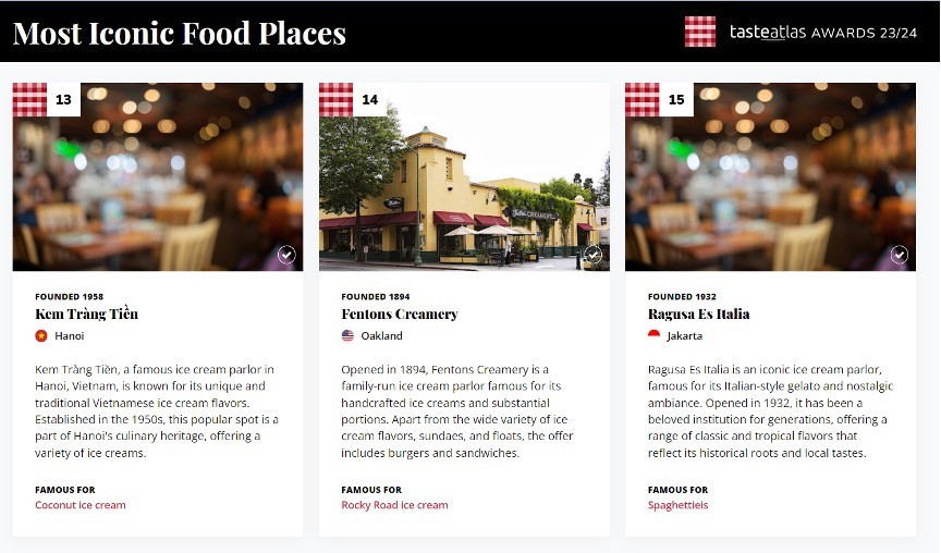 Website ẩm thực nổi tiếng thế giới Taste Atlas vừa công bố danh sách Most Iconic Food Places in the World (Những nơi bán đồ ăn mang tính biểu tượng nhất thế giới 2023), nhằm vinh danh các quán ăn, thương hiệu truyền thống phục vụ các món địa phương. Đáng chú ý, món kem Tràng Tiền của Việt Nam xếp hạng thứ 13/100 trong danh sách những địa điểm bán kem trứ danh thế giới, nổi tiếng với hương vị dừa.
