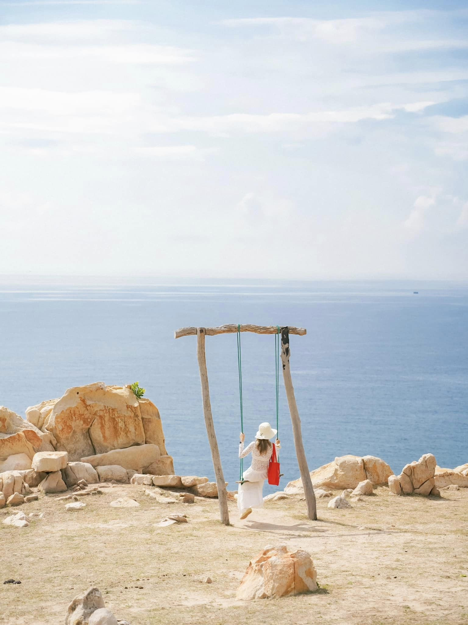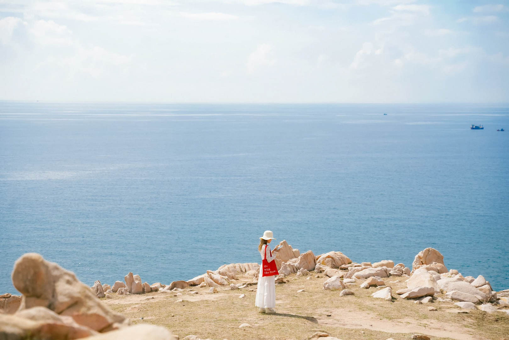 Cuối chiều, Phương chọn một quán cà phê đẹp tại Ninh Thuận để nghỉ ngơi. Cà phê Đoài được nhiều du khách trẻ yêu thích. Quán nằm cheo leo trên triền núi, có tầm nhìn hướng thẳng ra vịnh, không gian yên bình, thư giãn.