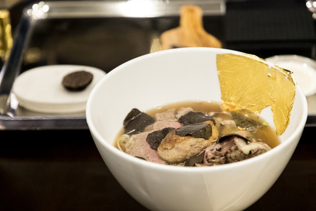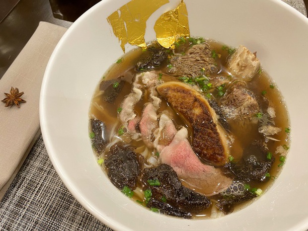 Bát phở có nấm truffle giá 45 triệu đồng/kg - đây là loại nấm đắt nhất thế giới, bò Wagyu 3,5 triệu đồng/kg - loại thịt bò mệnh danh đắt nhất thế giới, gan ngỗng béo Pháp 2,5 triệu đồng/kg, bát phở cũng được trình bày thêm vàng lá trên thành bát.