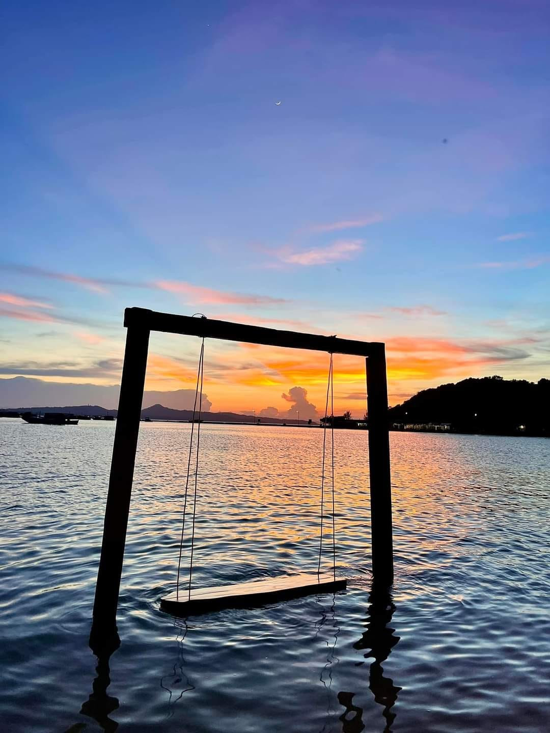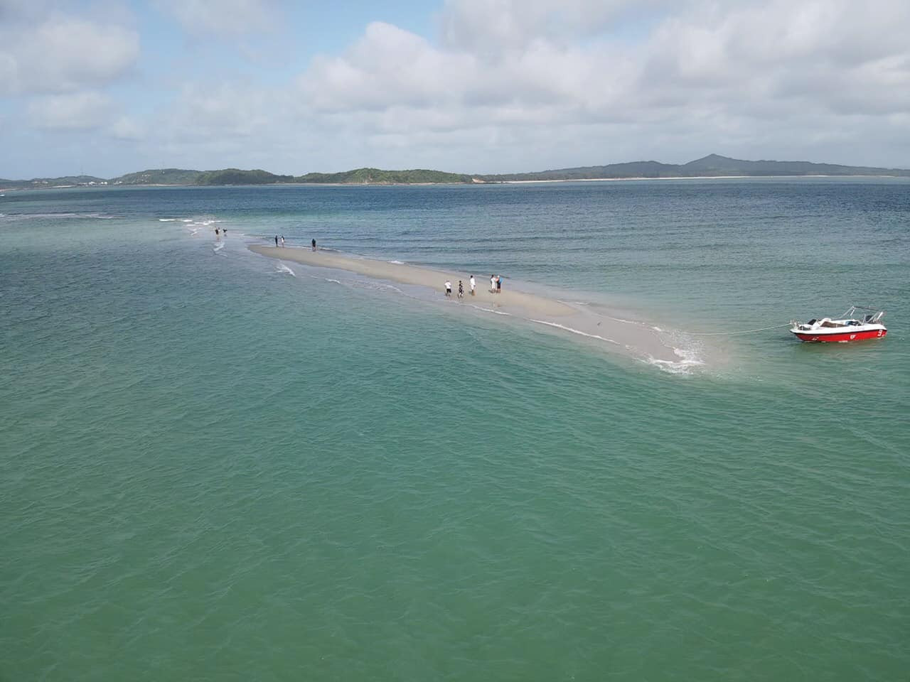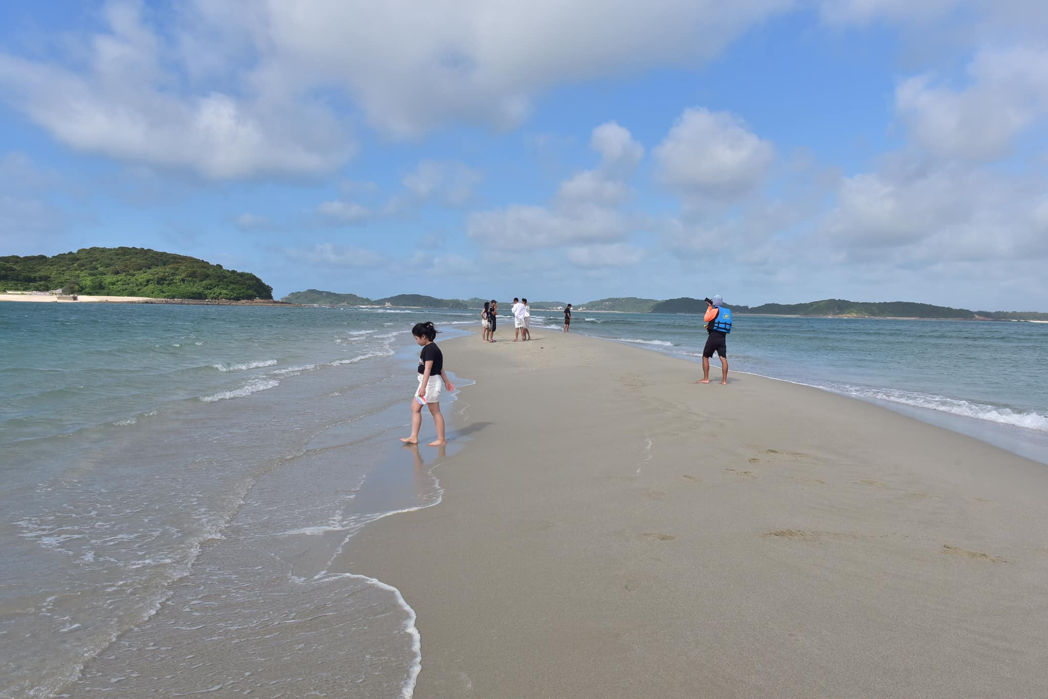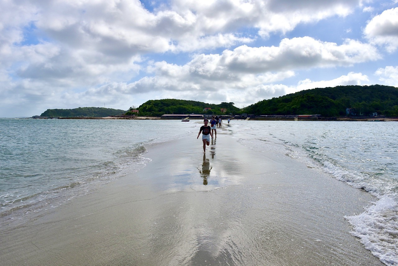 Tới đây, du khách thoải mái đi dạo trên bãi cát, tắm mình trong làn nước biển mát lạnh. Nước ở đây thời điểm này tương đối nông, trong xanh nhìn rõ đáy với những đàn cá con tung tăng bơi lội. Sóng biển đánh nhẹ vào từ cả hai phía cũng khiến du khách cảm thấy mới lạ và thích thú.