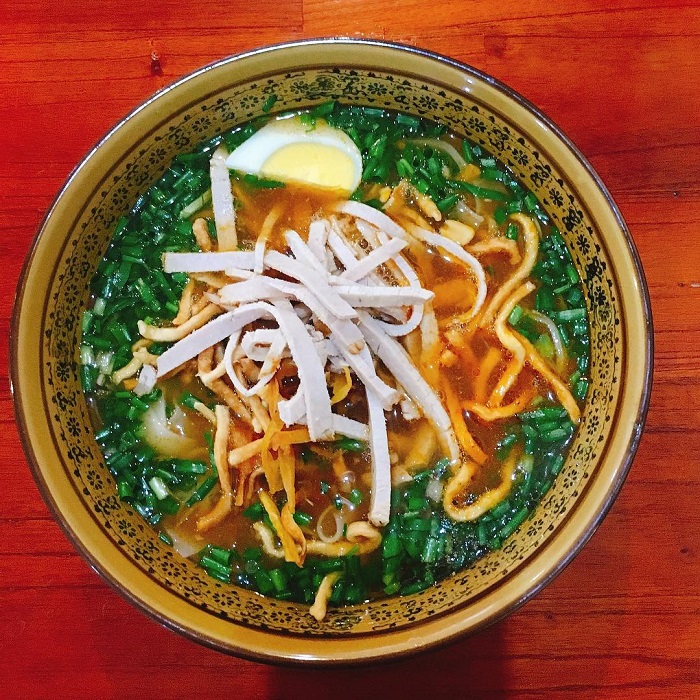 Bánh phở trắng tinh to hơn sợi phở Hà Nội sẽ được đặt dưới đáy bát. Trên lớp phở ấy người ta rắc chút mỳ bằng củ rong hoặc khoai lang rang giòn cùng nhiều gia vị, thịt bò được nấu sền sệt kì công, thịt lợn thái sợi, miếng trứng luộc cắt làm tư và một chút bột tiêu nhỏ mịn, hạt đậu phộng dã nhuyễn lên trên cùng.