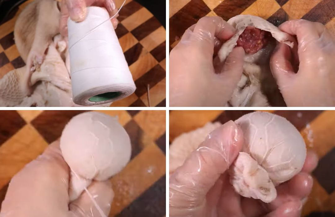 - Bao tử dê đem sơ chế sạch. Dùng muỗng cho một lượng hỗn hợp thịt vừa xay vào bao tử, khéo léo tạo hình vo tròn rồi dùng chỉ buộc nút thắt. Dùng kéo cắt phần bao tử dư phía rìa ngoài và cứ thế lặp lại nhiều lần để có số lượng viên thịt như ý.