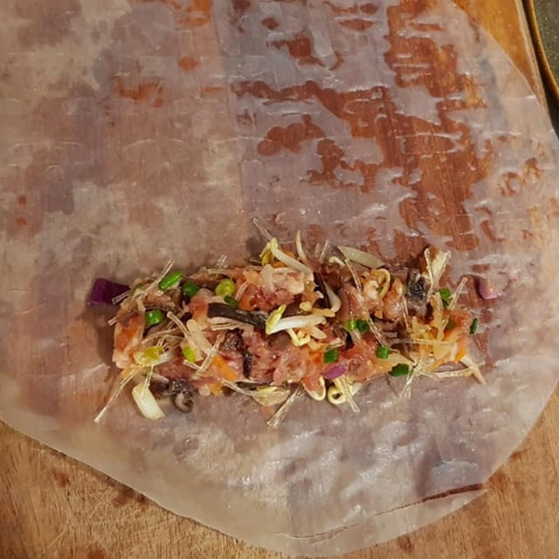 - Bạn dùng muỗng múc lượng nhân bằng khoảng 3 ngón tay trải vào đầu lá nem. Sau đó cuộn chắc tay 2 vòng rồi dừng để gấp 2 đầu lá nem lại. Gấp xong thì tiếp tục cuốn đến khi hết lá nem.