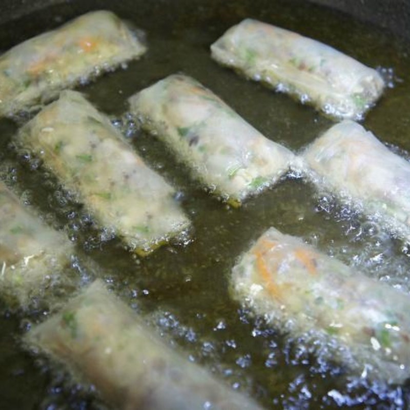 - Chờ dầu sôi lăn tăn thì thả từng cuộn nem vào và hạ nhỏ lửa. Khi chiên được khoảng 3 phút, bạn lật mặt nem rồi tiếp tục chiên thêm khoảng 3 phút.