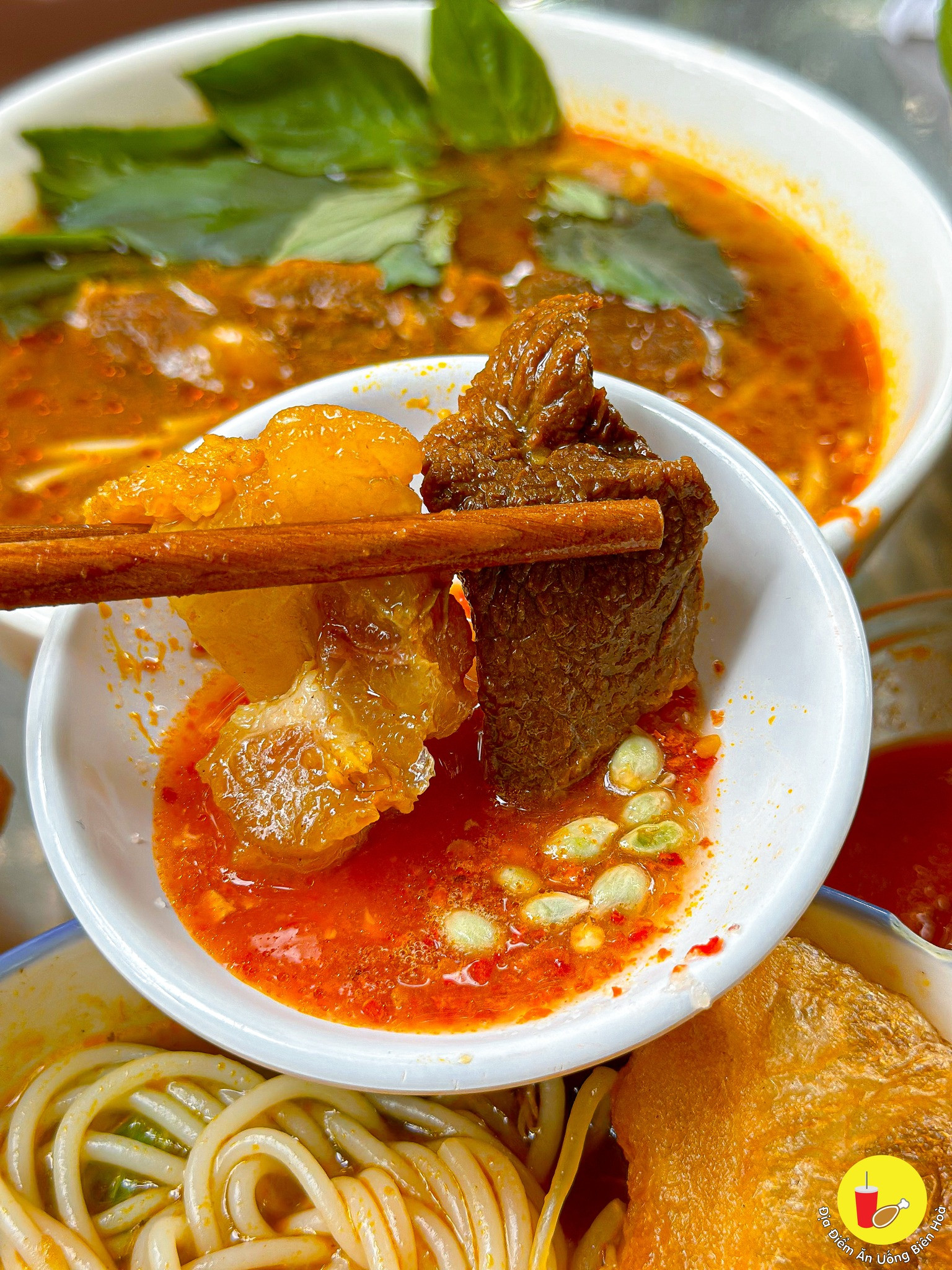 Tô bún có những cục thịt bò vuông vức chừng ba ngón tay. Gắp một cục thịt chấm muối ớt cho vào miệng, hoặc nạc hoặc nạm hoặc gầu, gân, thứ nào cũng để lại hương vị đặc trưng ngon. Ăn xong, thực khách có thể cay đến chảy nước mắt, nhưng lại ưng ý bởi cái giòn, dai, bùi béo của thịt bò và vị chua kích thích dịch vị của chanh.