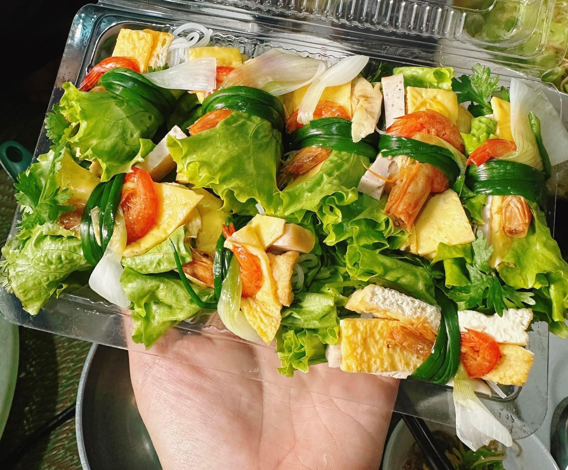 Lấy một lá xà lách, gập lại rồi đặt lần lượt rau mùi, rau răm lên. Xếp tiếp bún, tôm, giò, đậu, thịt, trứng lên phần rau một cách khéo léo sao cho các nguyên liệu không che chắn nhau rồi lấy hành lá đã trần để cuộn lại.