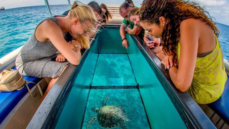 Trong trường hợp bạn không muốn tham gia lặn biển thì có thể thử nghiệm khám phá thế giới dưới lòng nước thông qua tàu đáy kính. Con tàu tròn và có hình dáng trông như một chiếc thuyền thúng và bên dưới sẽ có một lớp kính để khách du lịch có thể ngắm nhìn.