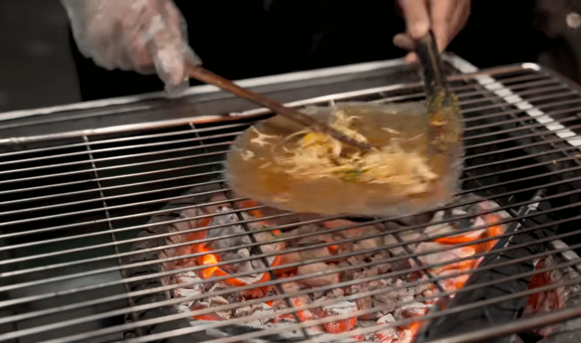 Cuối cùng, họ thưởng thức phần bánh tráng nướng đặc biệt với nguyên liệu đầy đặn, gồm mực, chà bông heo (ruốc heo), bắp cải tím và sốt mayonaise.