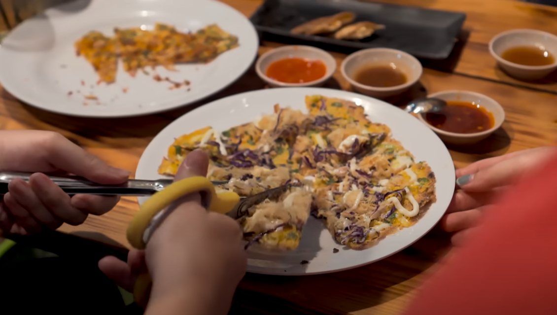 Sau vài phút chờ đợi, các thành viên đã được nhân viên phục vụ bưng lên suất bánh tráng nướng giòn rụm, nóng hổi, cắt thành từng miếng tam giác nhỏ vừa ăn. Lớp bánh mỏng, chế biến đơn giản với chút hành lá, bò khô ở trên và trứng tráng ở dưới.