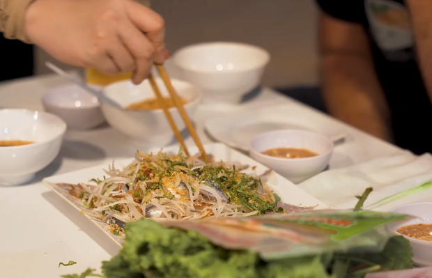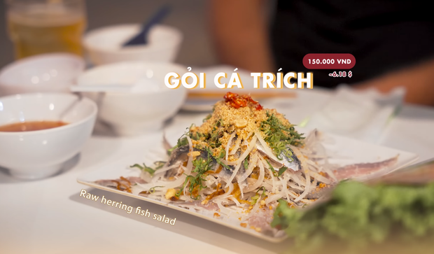 Nhân viên nhà hàng mang ra một đĩa cá trích sống trộn với dừa nạo, hành tây sống, hành tím phi, ngò gai và đậu phộng giã. Người này đã hướng dẫn 2 vị khách trộn gỏi, sau đó cuốn bánh tráng, ăn kèm gỏi gồm có các loại rau như: Xà lách, tía tô, diếp cá, lá bứa. Một đĩa gỏi cá trích được bán tại nhà hàng với giá 150 nghìn đồng (~ 6.18 $)
