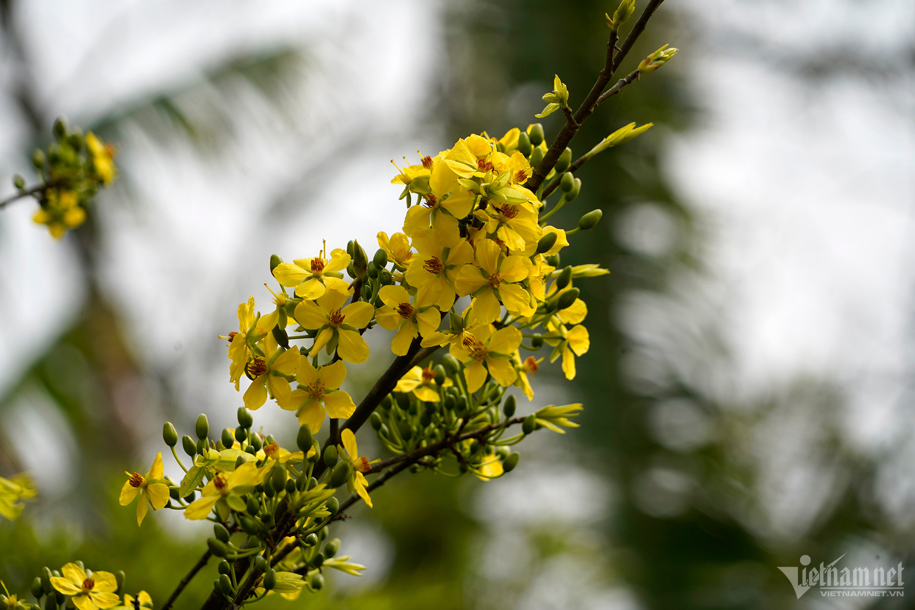 Lúc này, hàng loạt cây mai rụng hết lá cũ, thay vào đó là màu vàng rực của hàng triệu bông hoa nở thành chùm.