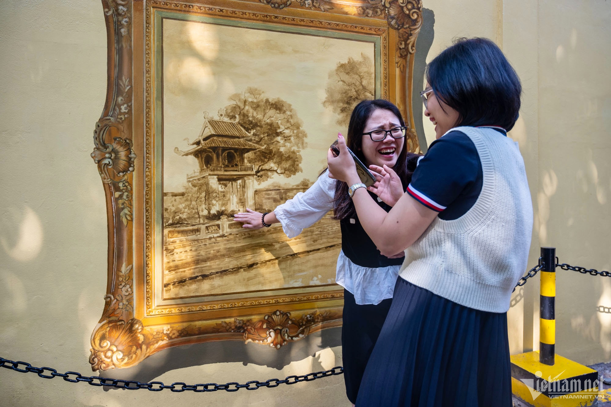 "Chúng em đi bộ dọc vỉa hè Phan Đình Phùng để tham quan tháp nước Hàng Đậu, khi qua đây thực sự bị ấn tượng bởi những bức tranh 3D", Thu (Hà Đông) chia sẻ.