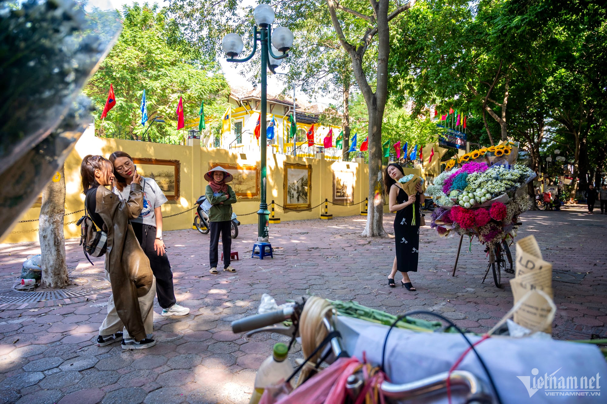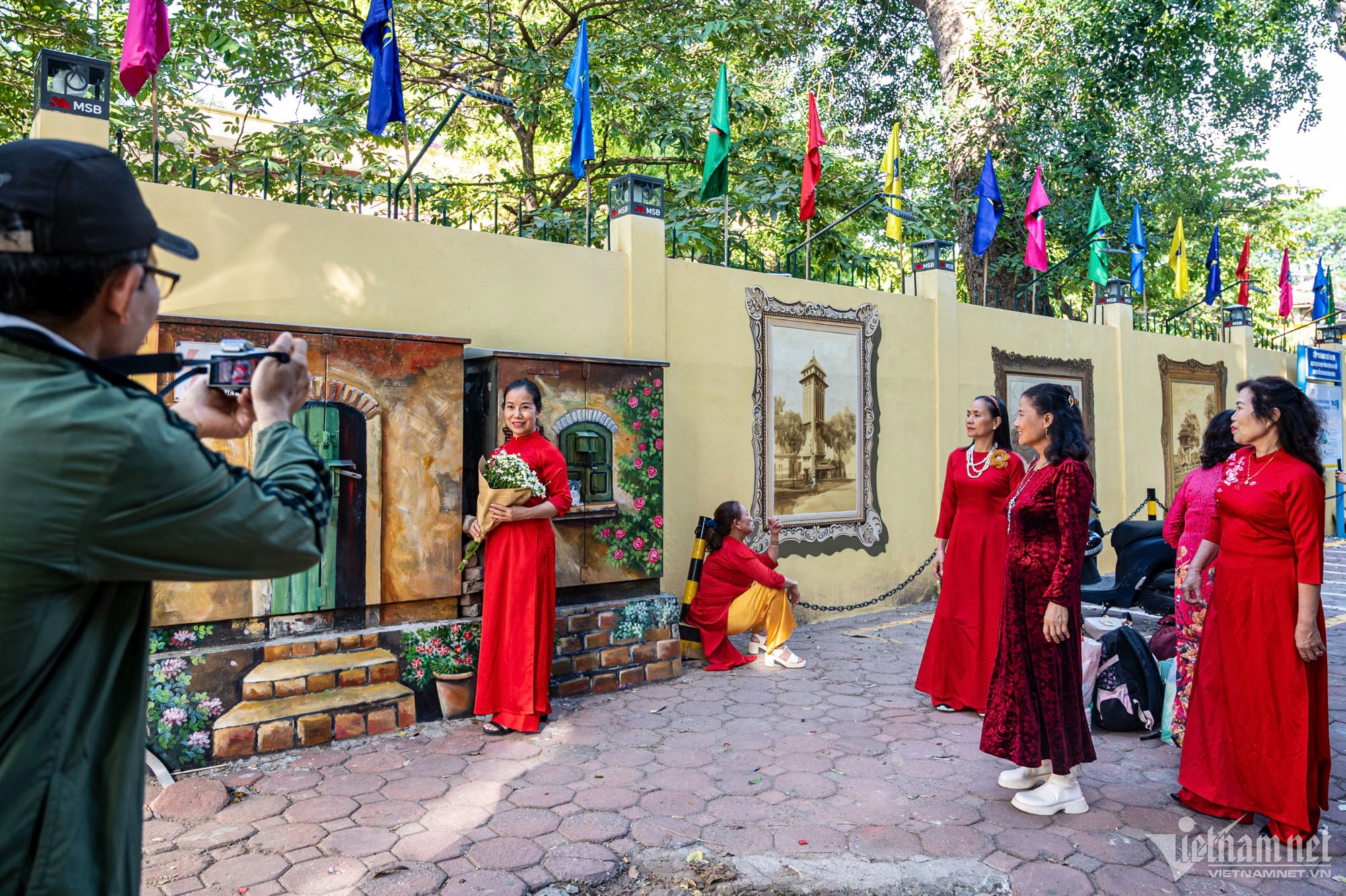 Trong tiết trời nắng đẹp chiều thứ 6 (17/11), nhiều chị em xúng xính áo dài, tay ôm hoa, chụp ảnh cùng một Hà Nội thu nhỏ.